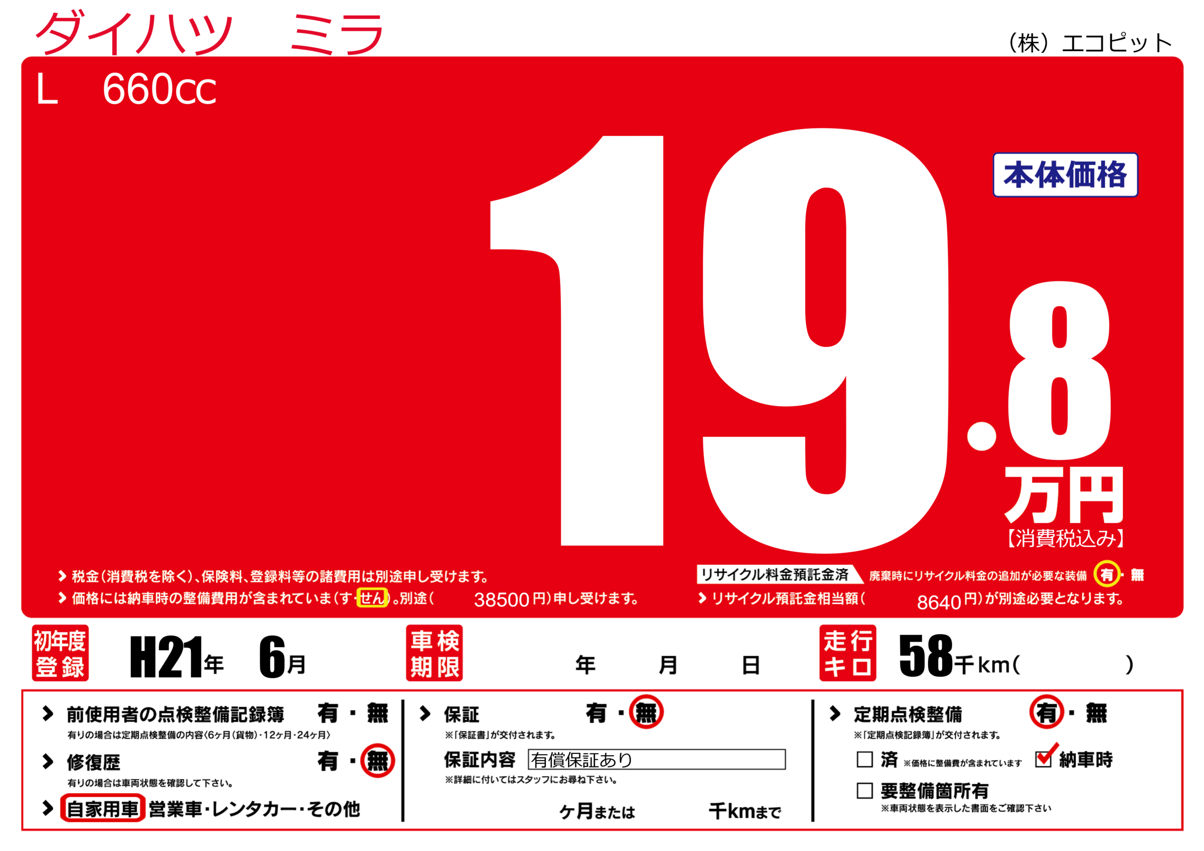 | 車名 | ダイハツ ミラ | グレード ミッション 排気量 |