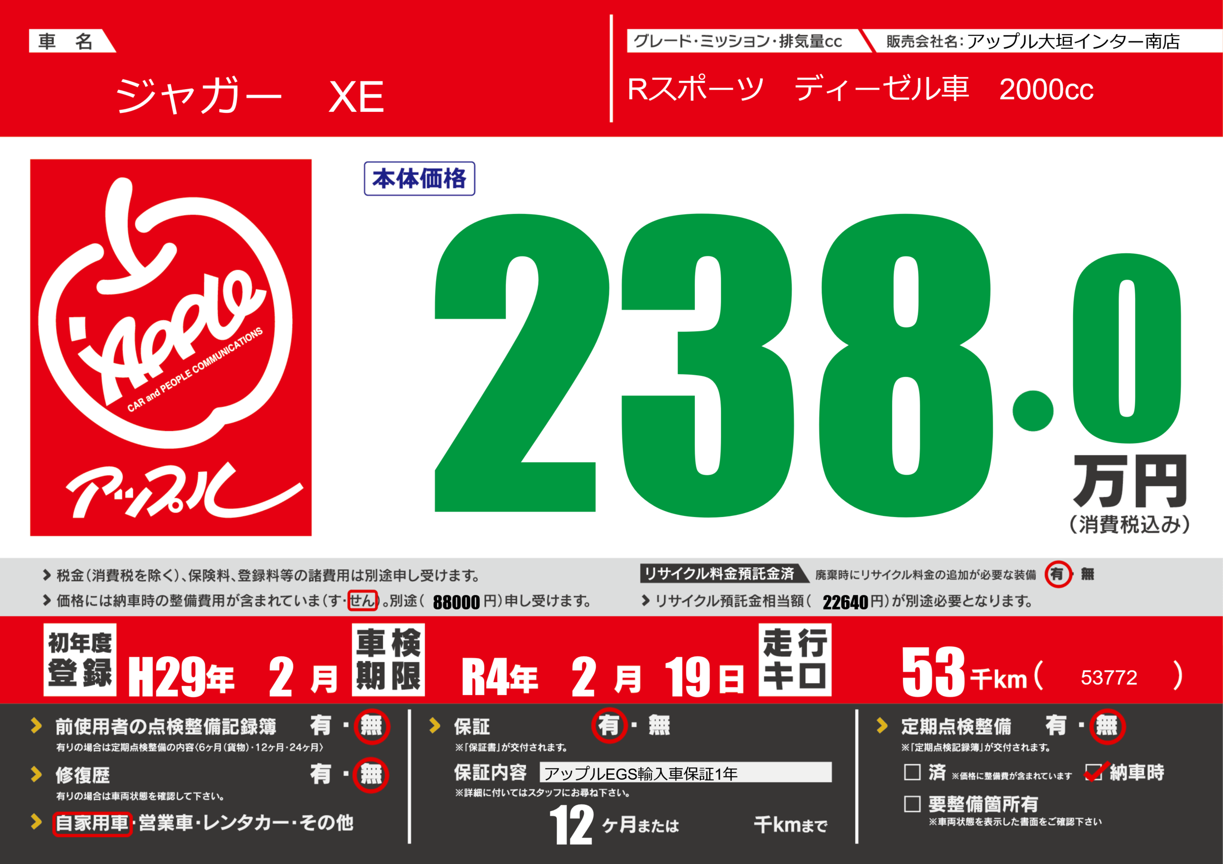 | 車名 | ジャガー XE | グレード ミッション 排気量 |