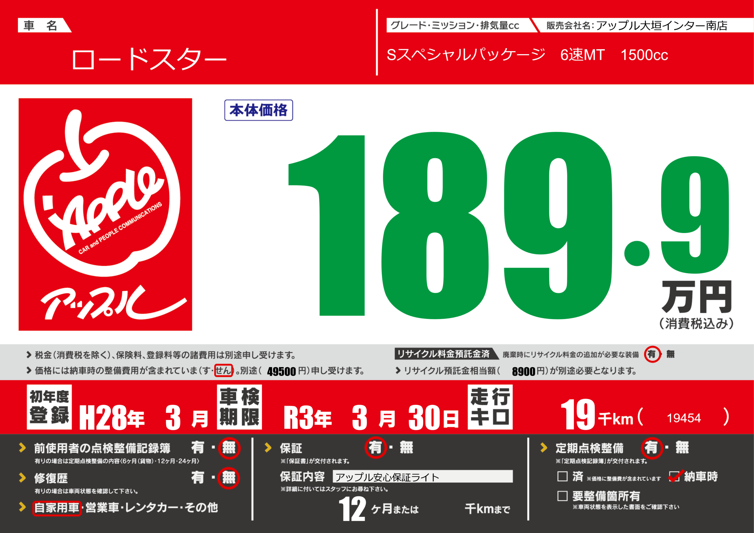 保証付き 保証内容(アップル安心保証ライト) 12ヶ月または()千kmまで |