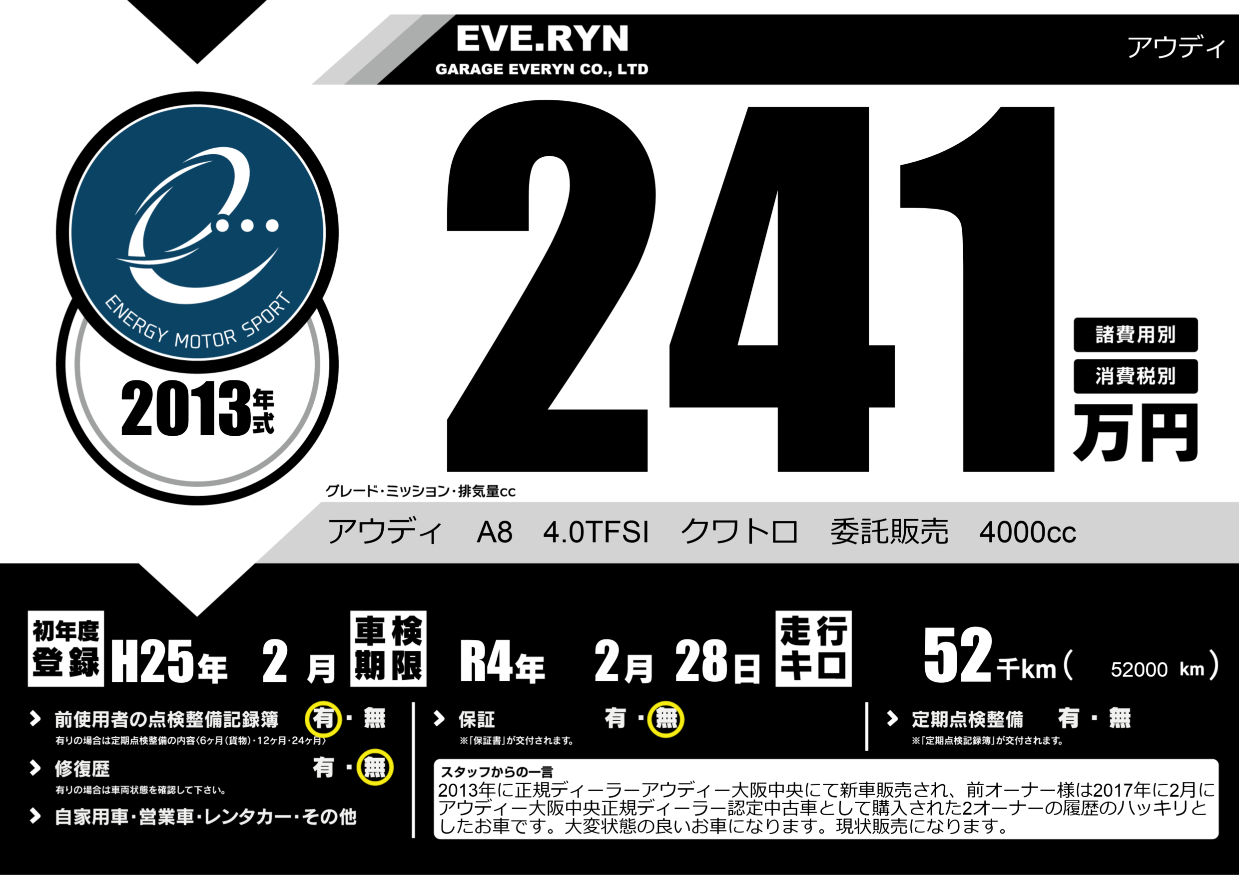 | 車名 | アウディ | グレード ミッション 排気量 |