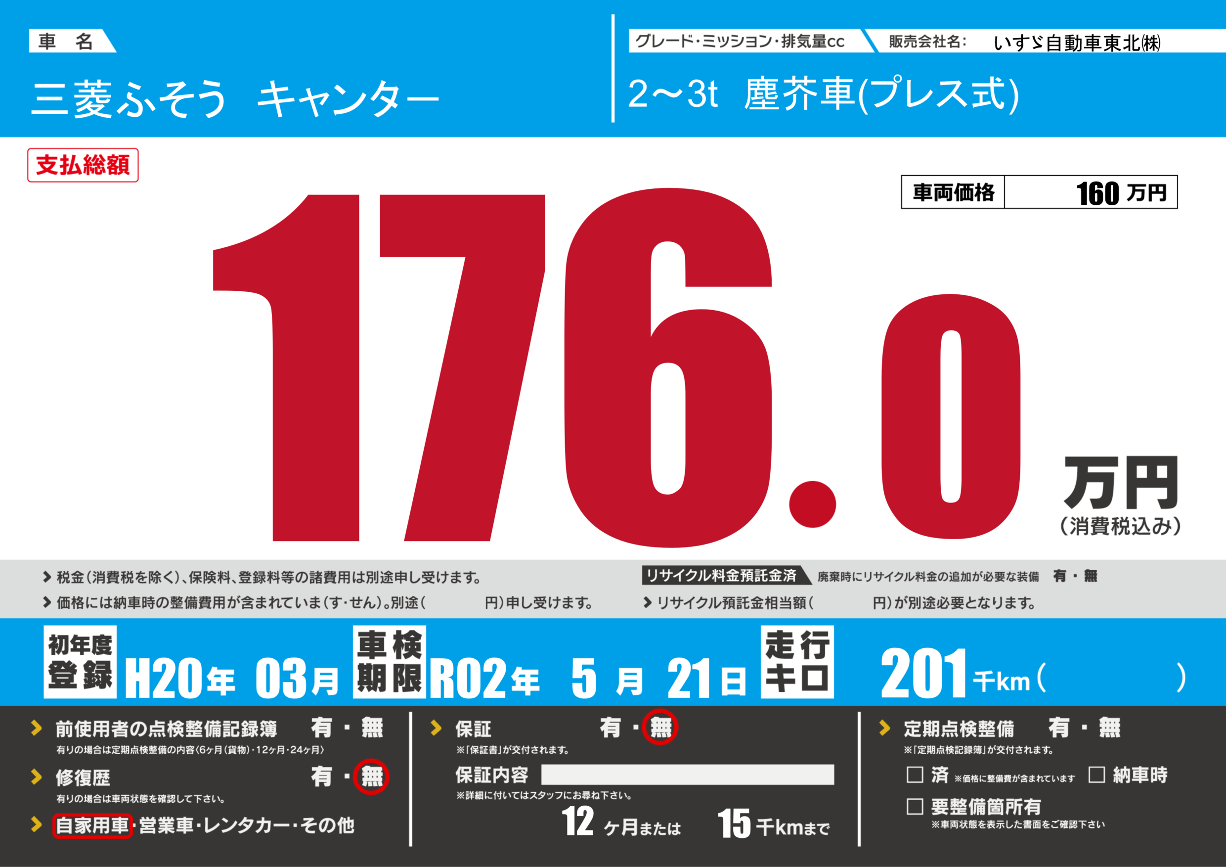 | 車名 | 三菱ふそう キャンタ- | グレード ミッション 排気量 |