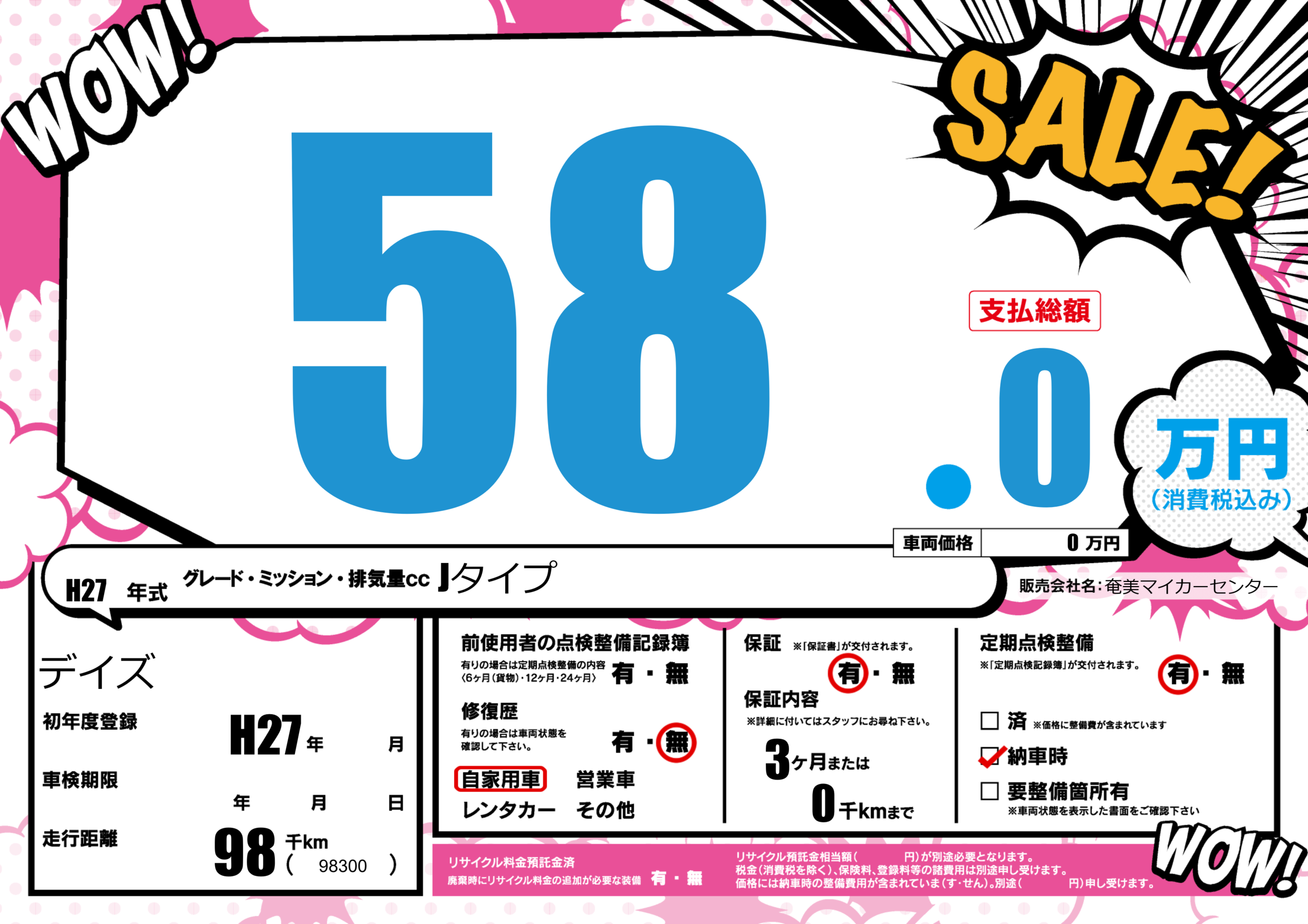 | 走行キロ | 9.8万km | 初年度登録 | H27年---月 |
