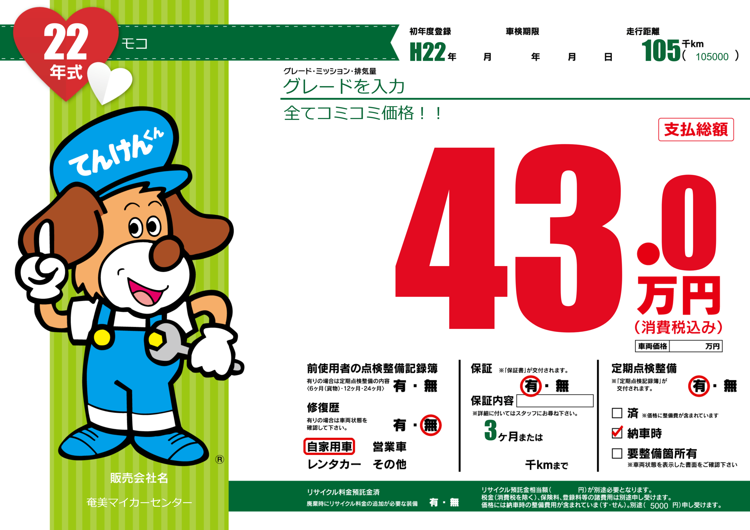 | 定期点検整備 | 定期点検整備あり 納車時あり | ||