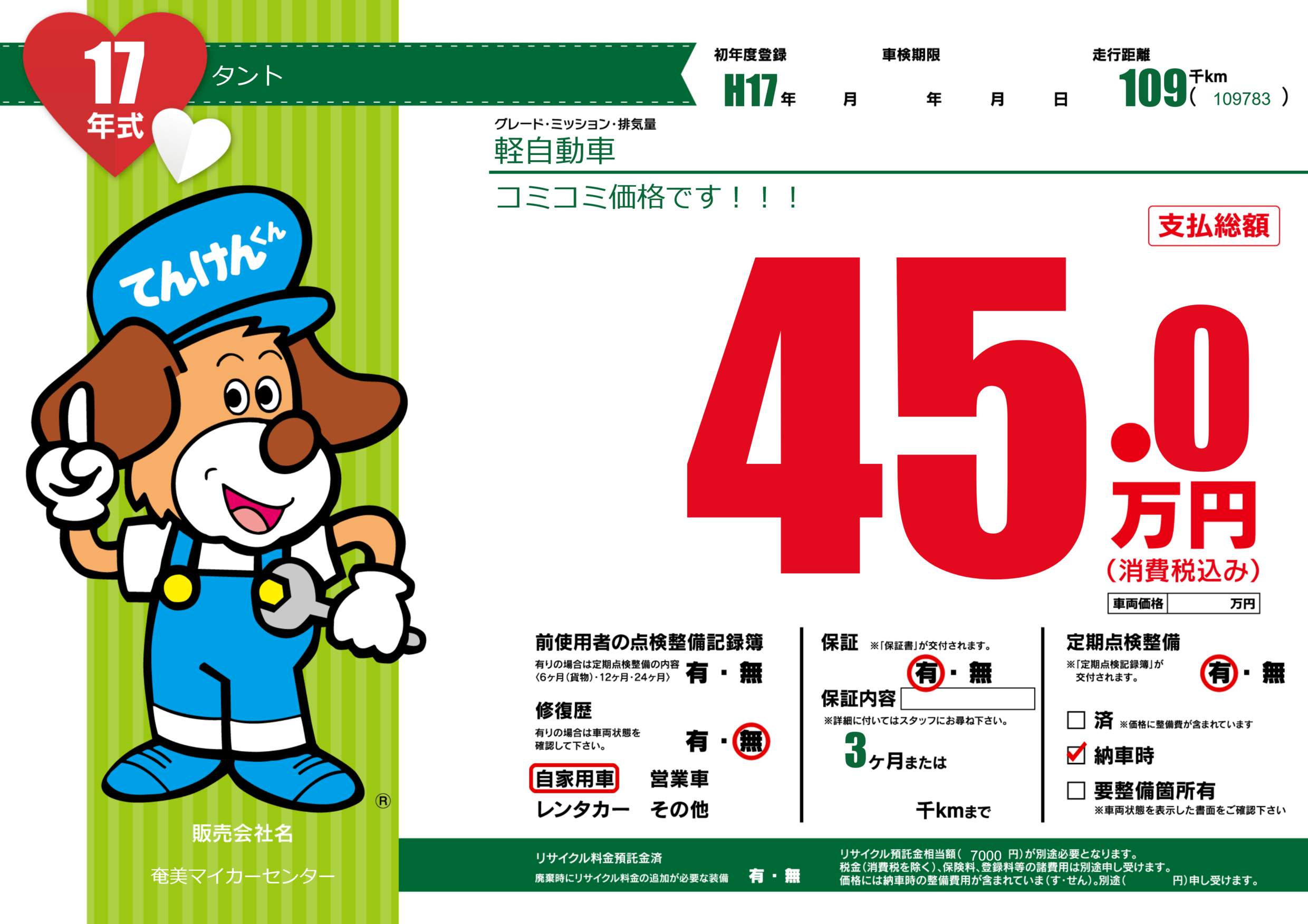 | 定期点検整備 | 定期点検整備あり 納車時あり | ||