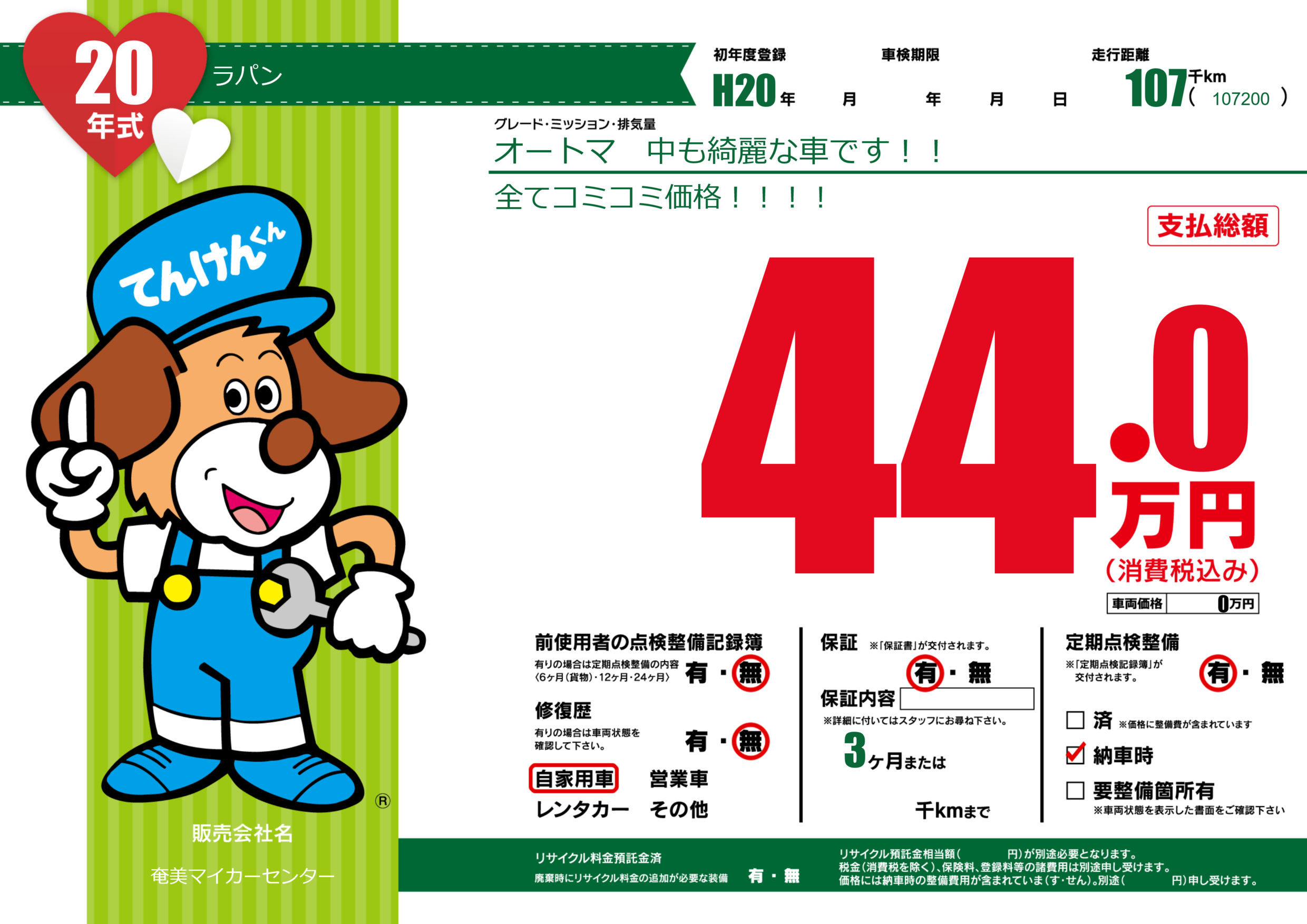| 定期点検整備 | 定期点検整備あり 納車時あり | ||