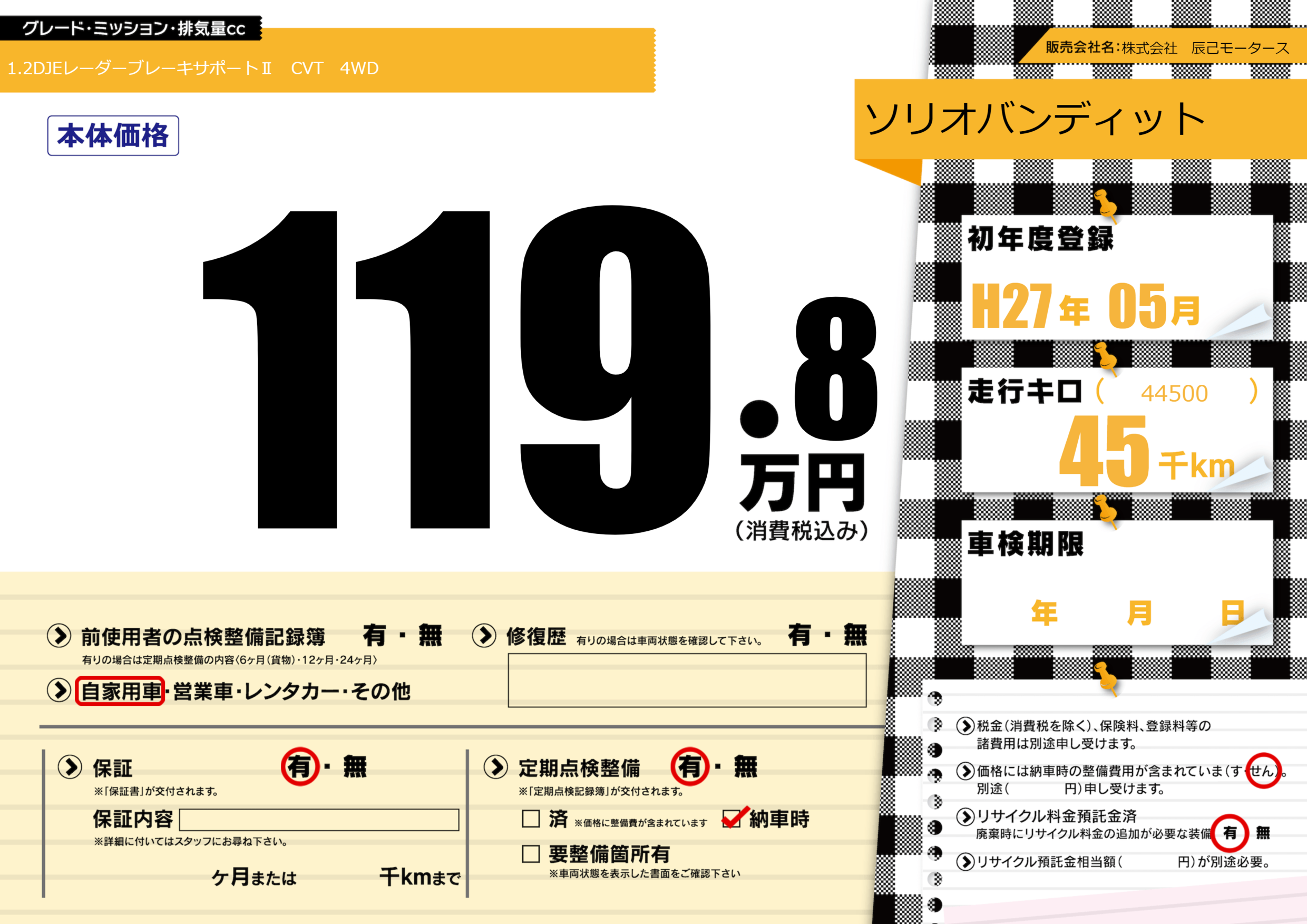| 定期点検整備 | 定期点検整備あり 納車時あり | ||