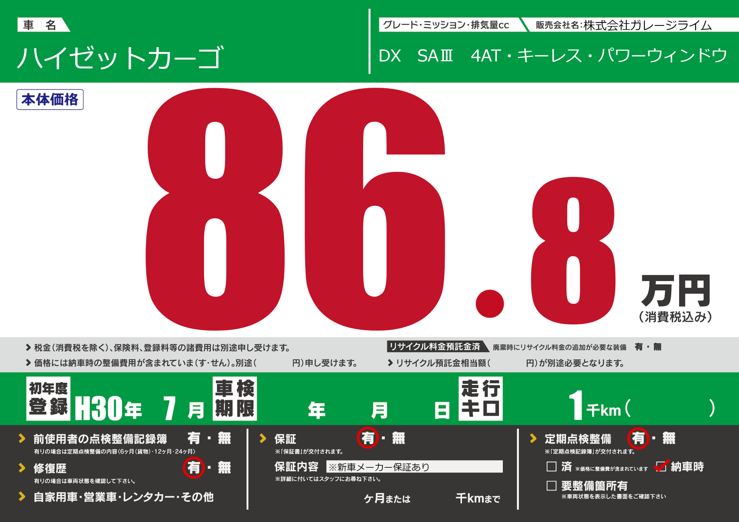 | 車名 | ハイゼットカーゴ | グレード ミッション 排気量 |