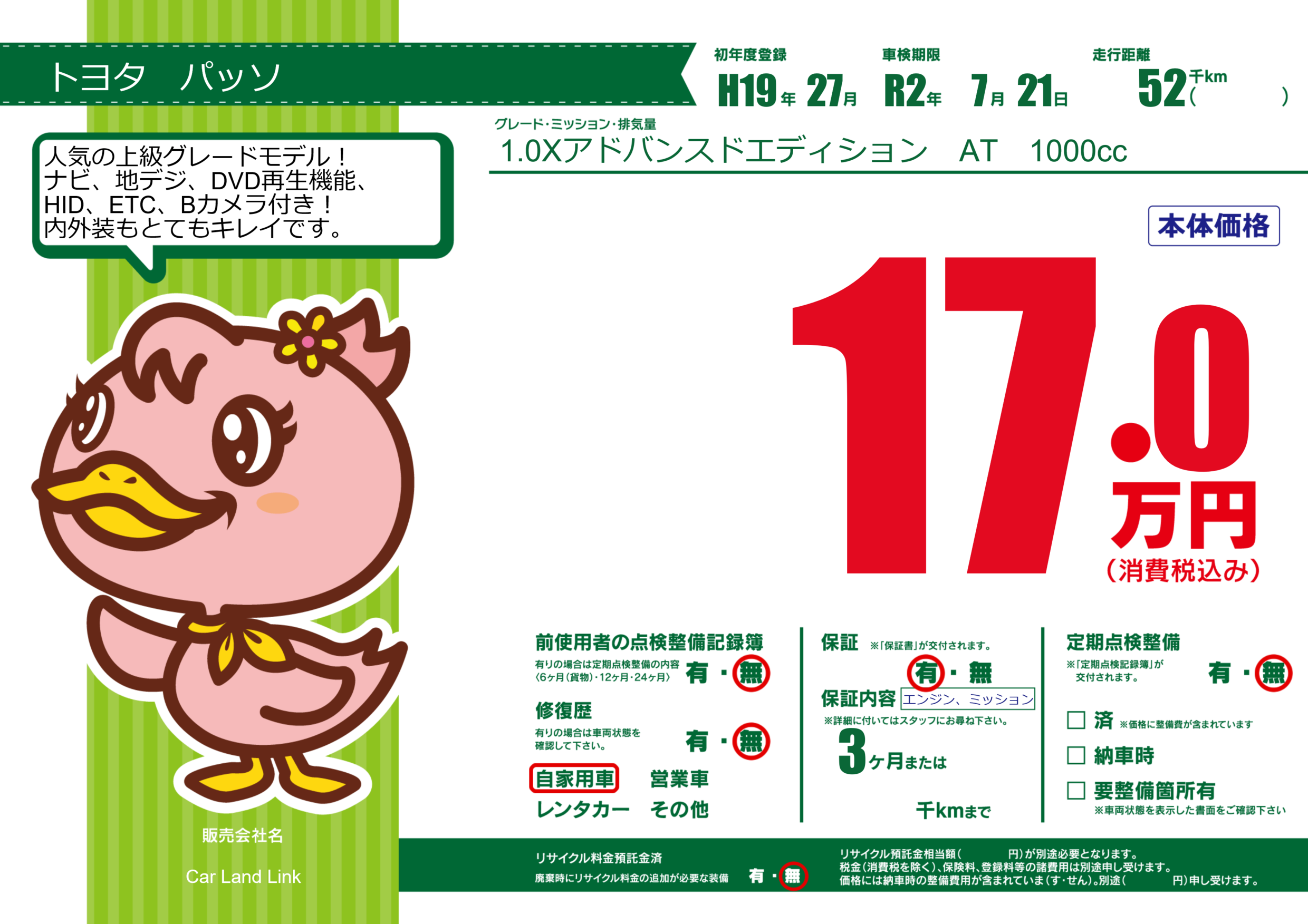 | 走行キロ | 5.2万km | 初年度登録 | H19年27月 |