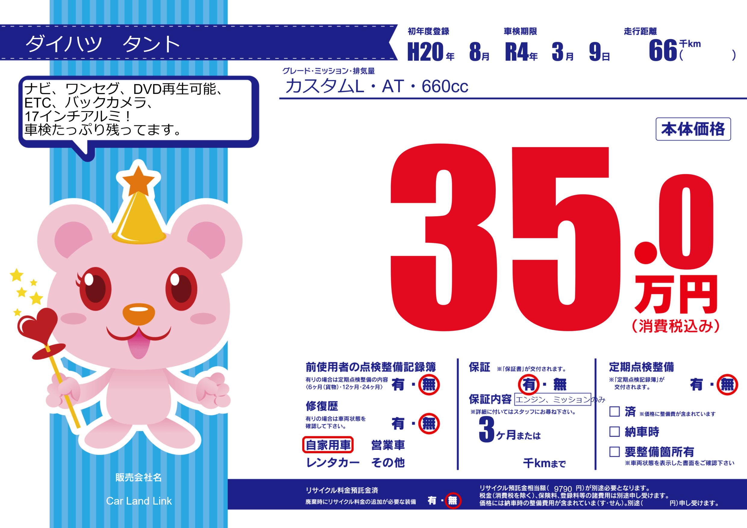 | 車名 | ダイハツ タント | グレード ミッション 排気量 |