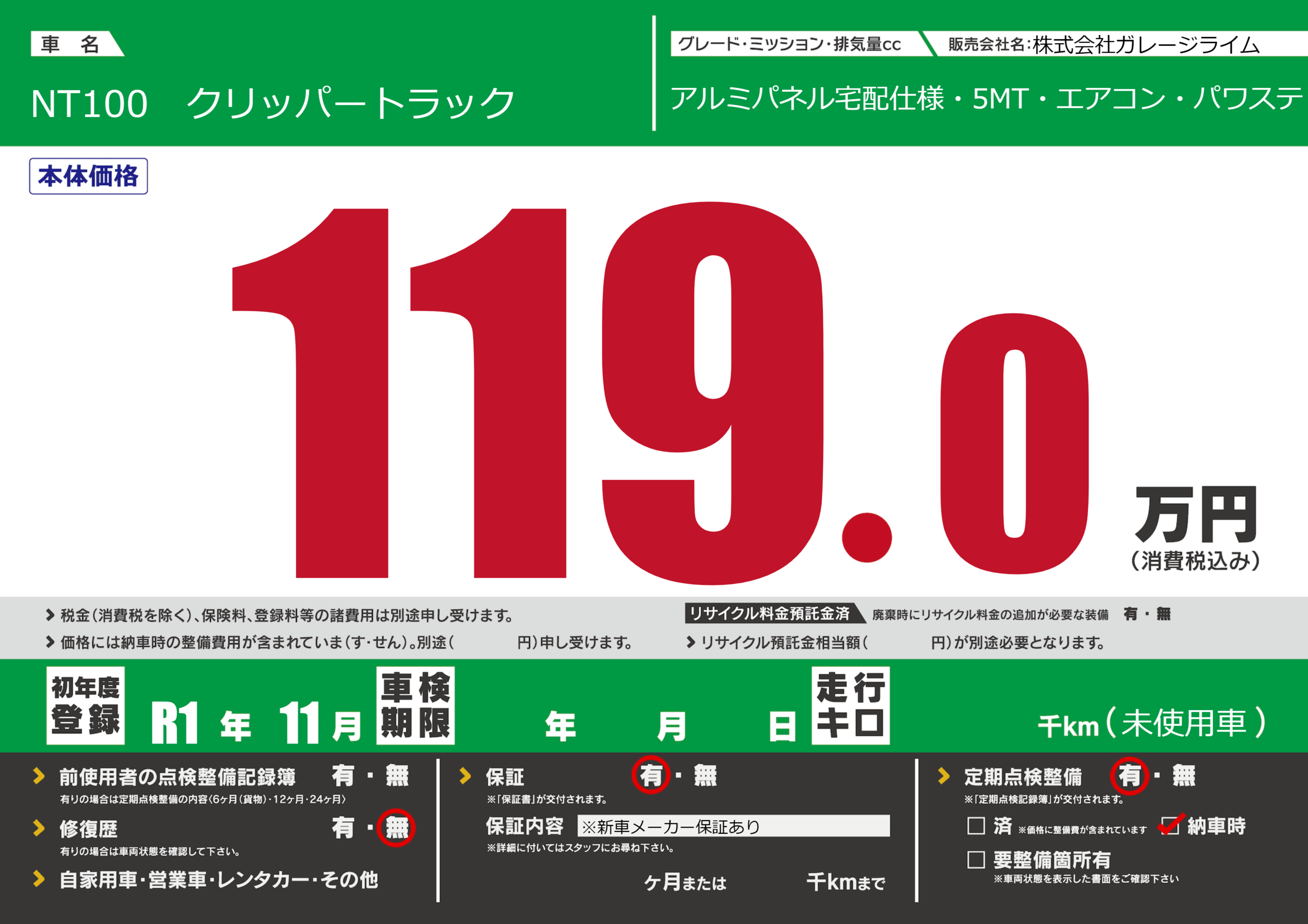 | 定期点検整備 | 定期点検整備あり 納車時あり | ||