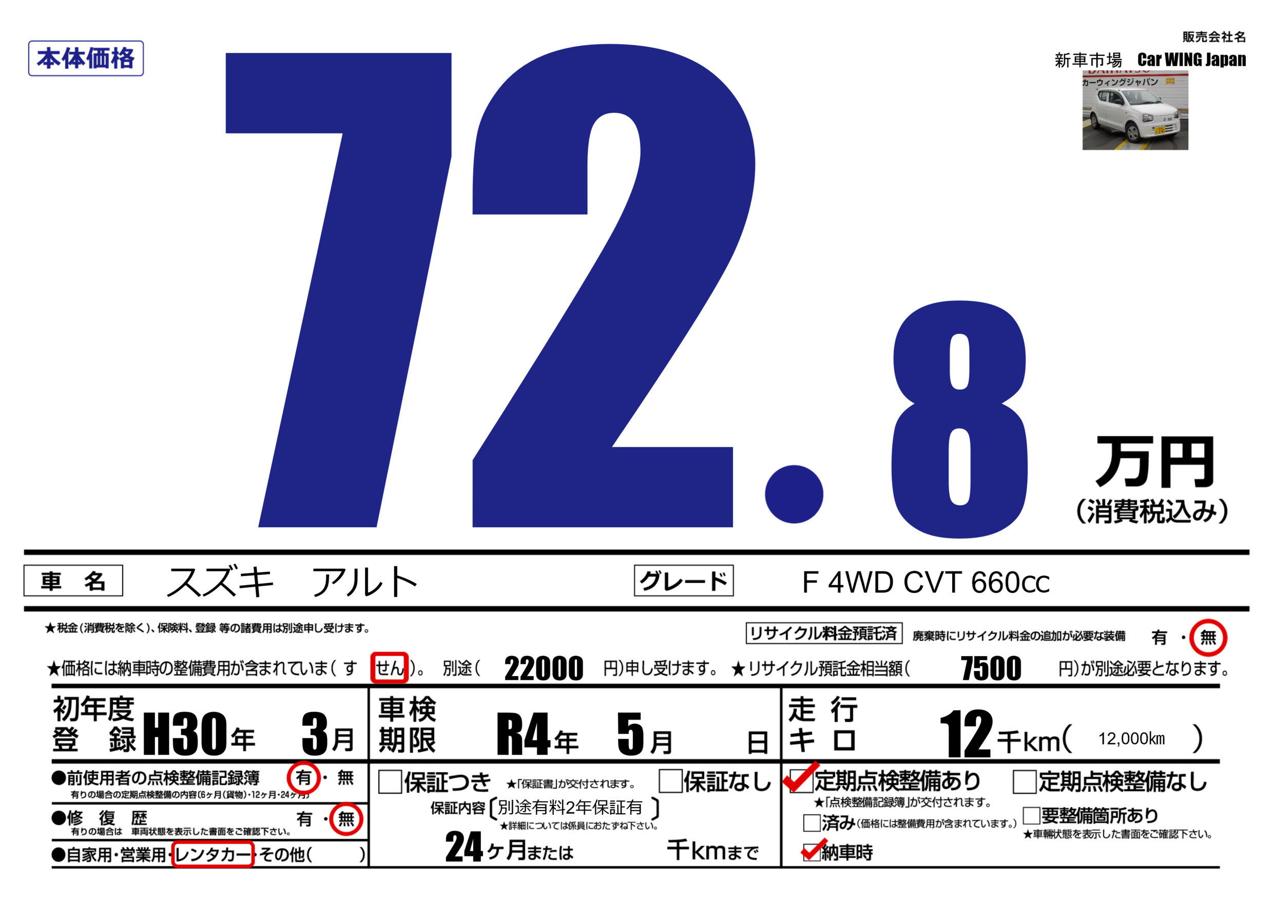| 車名 | スズキ アルト | グレード ミッション 排気量 |