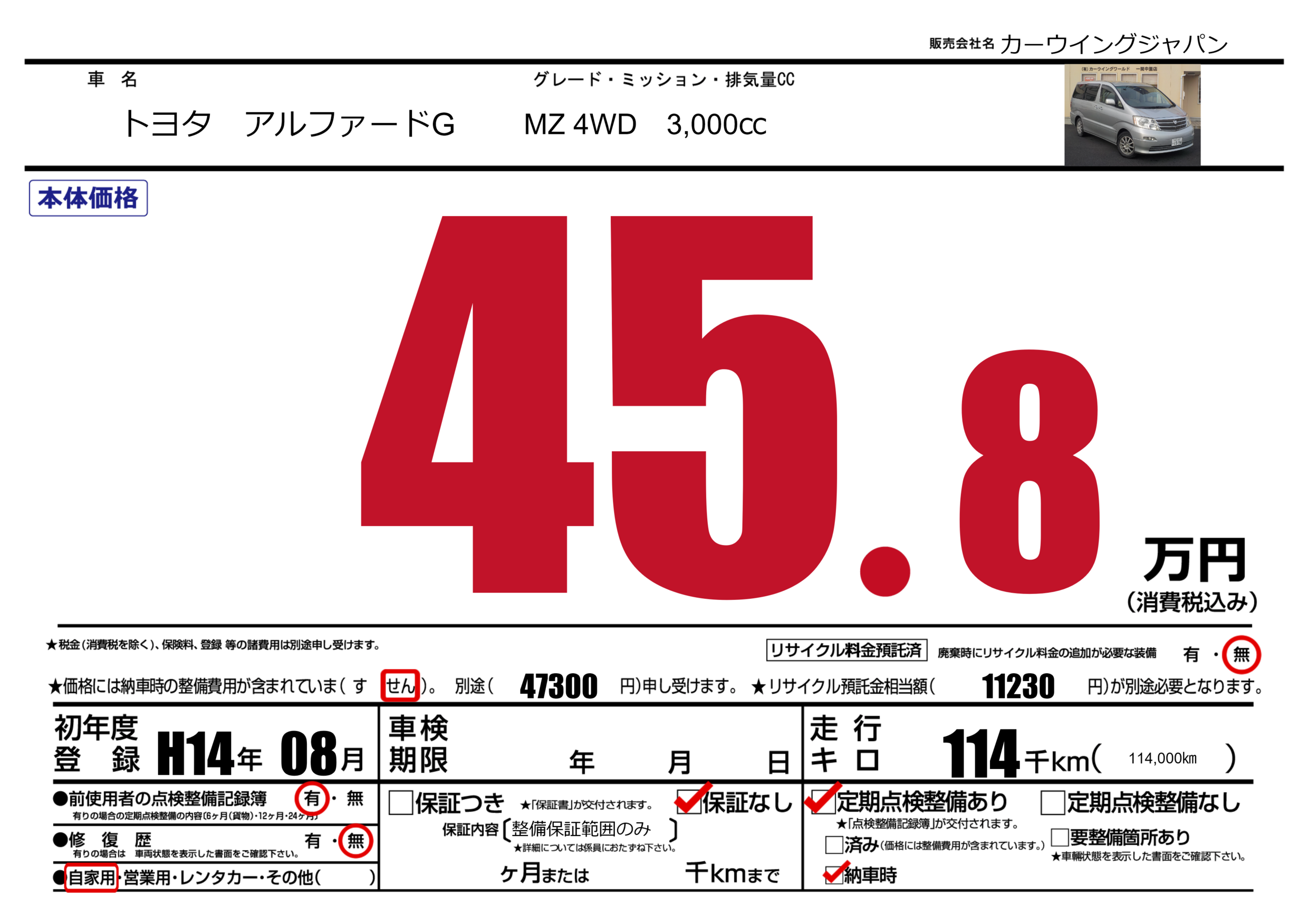 | 車名 | トヨタ アルファードG | グレード ミッション 排気量 |
