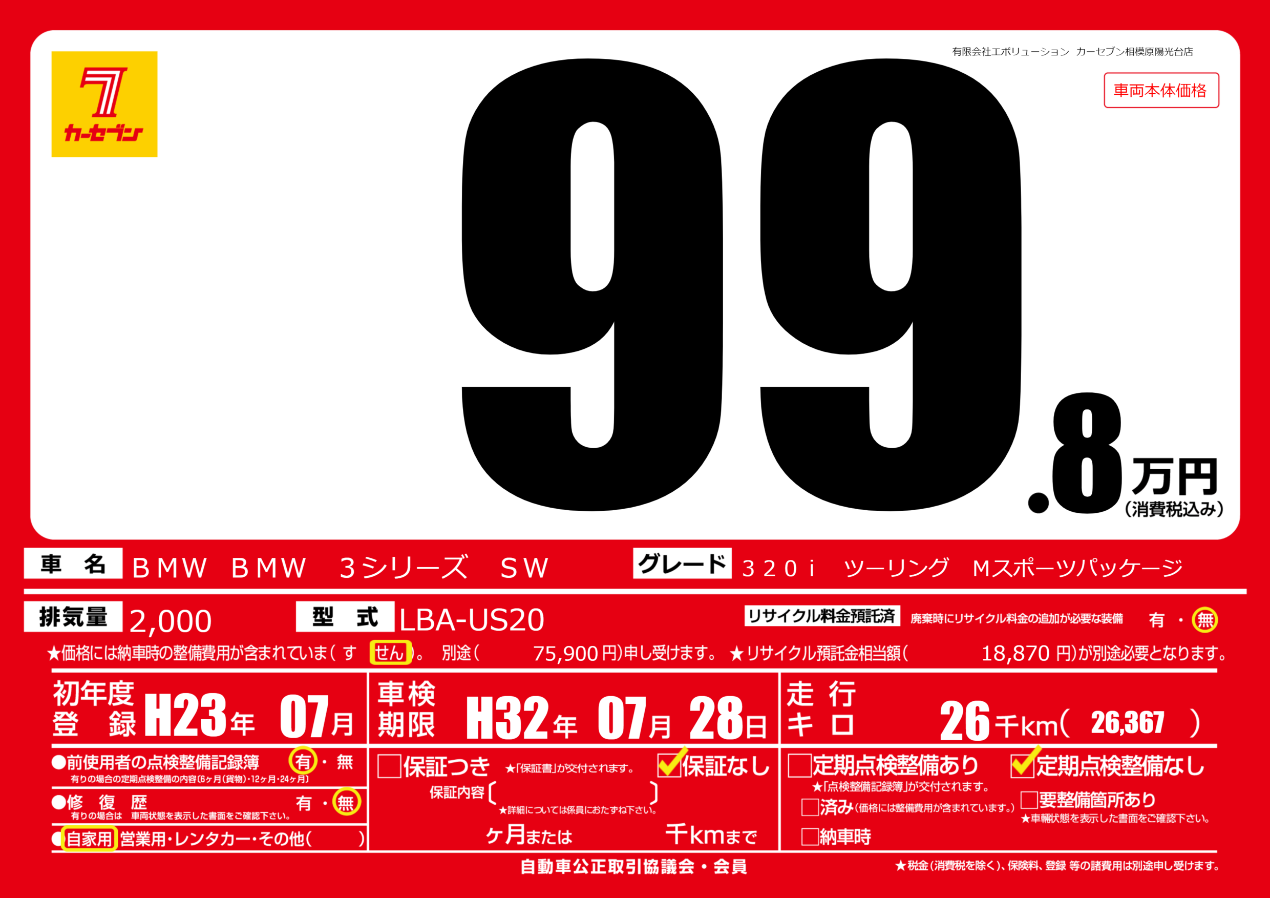 | 車名 | BMW BMW 3シリーズ SW | グレード ミッション 排気量 |
