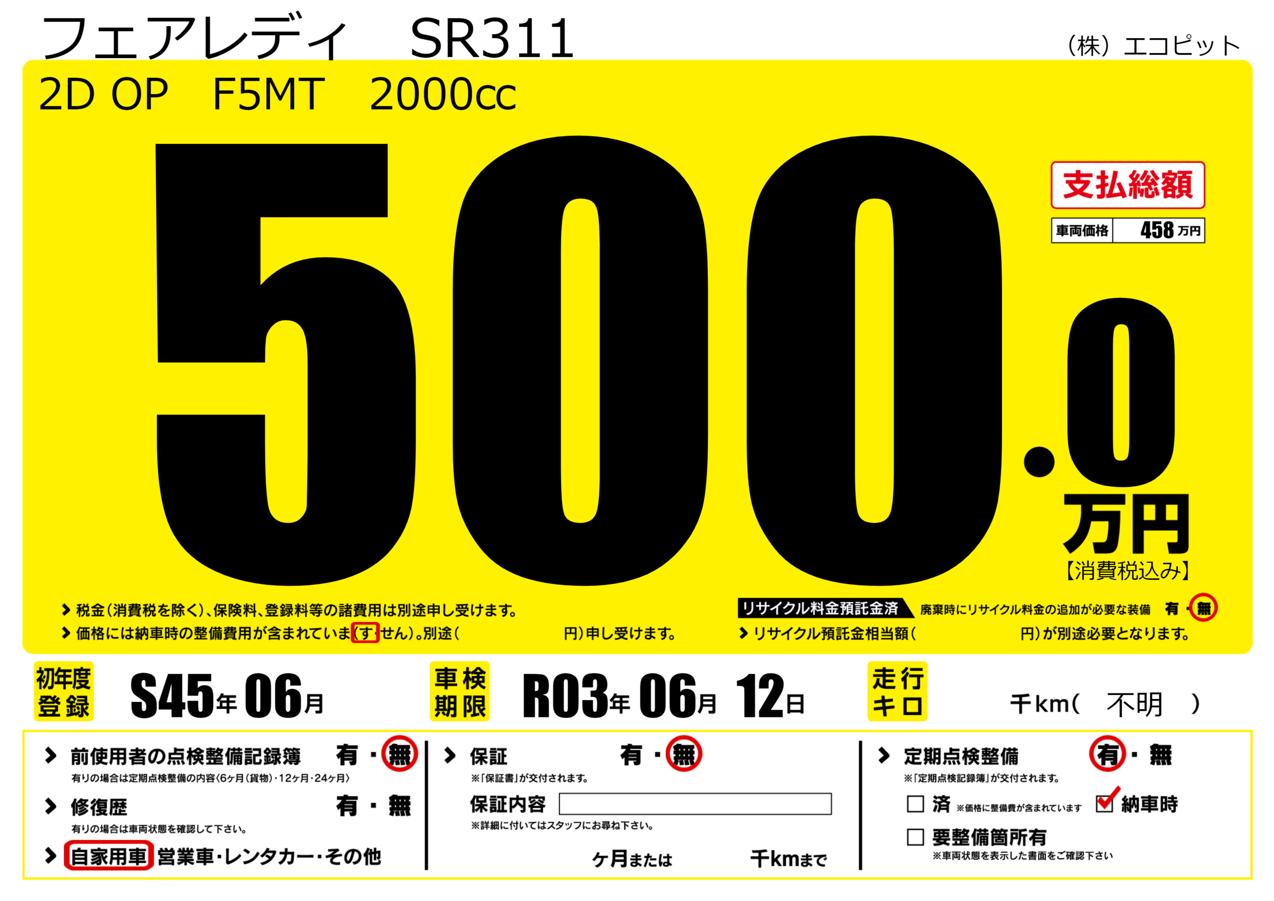 | 車名 | フェアレディ SR311 | グレード ミッション 排気量 |