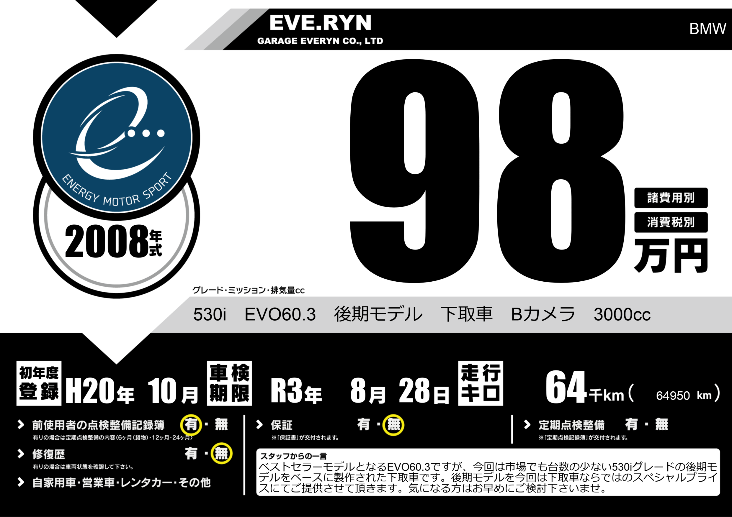 530i EVO60.3 後期モデル 下取車 Bカメラ 3000cc |