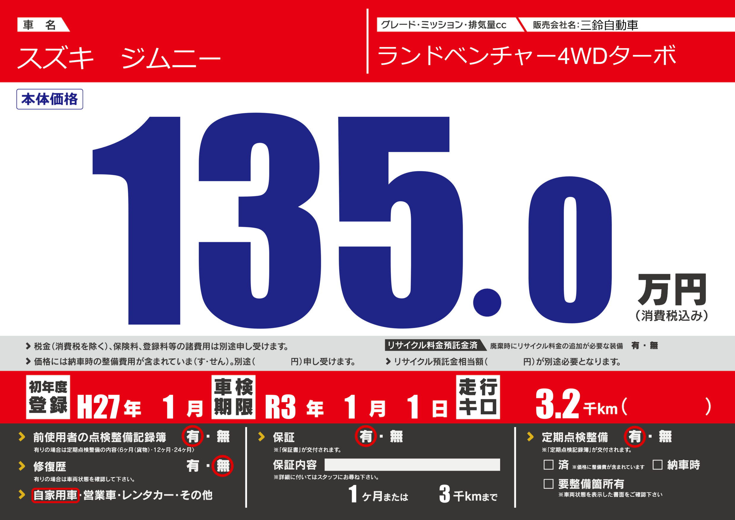 | 車名 | スズキ ジムニー | グレード ミッション 排気量 |