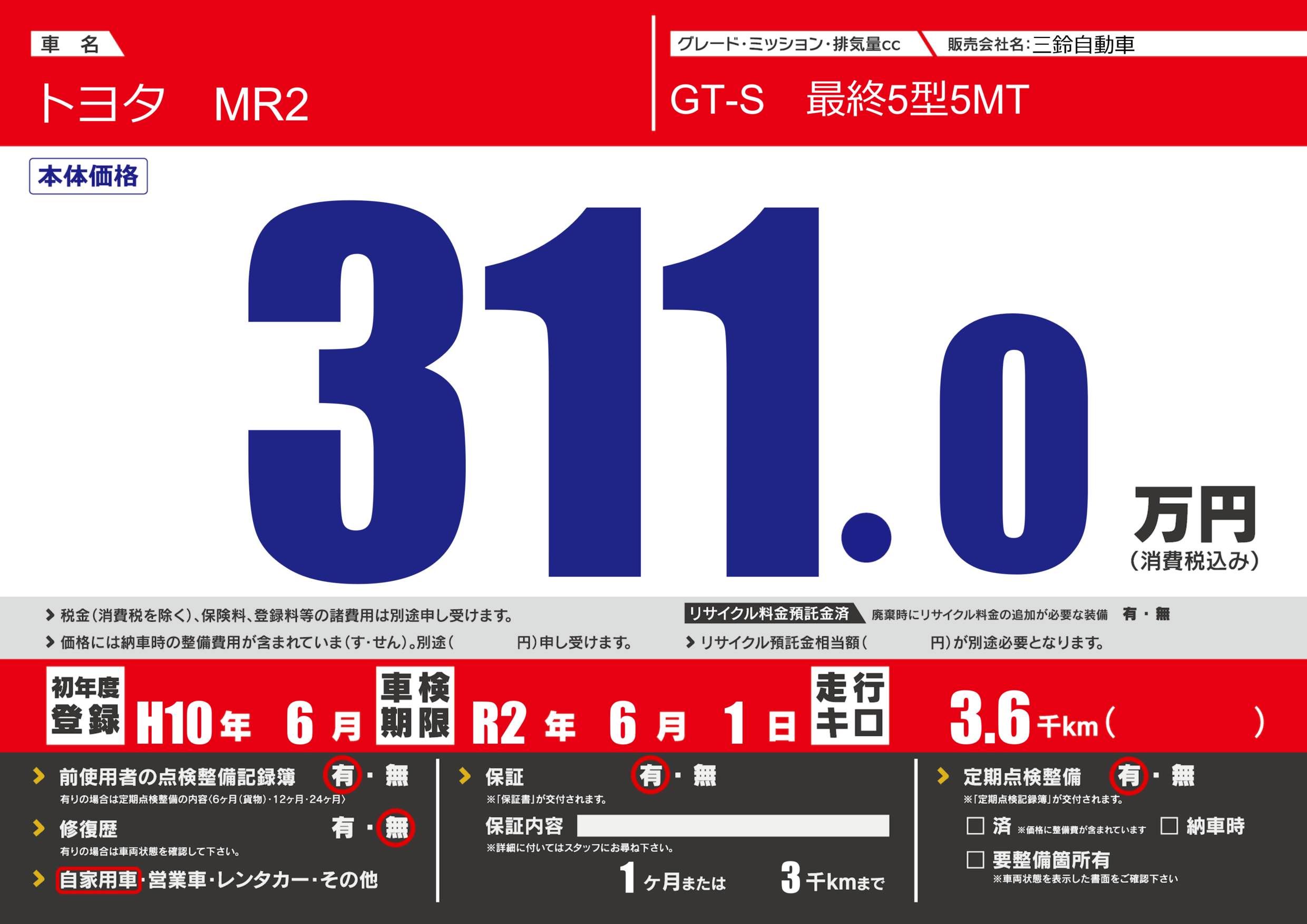 | 車名 | トヨタ MR2 | グレード ミッション 排気量 |