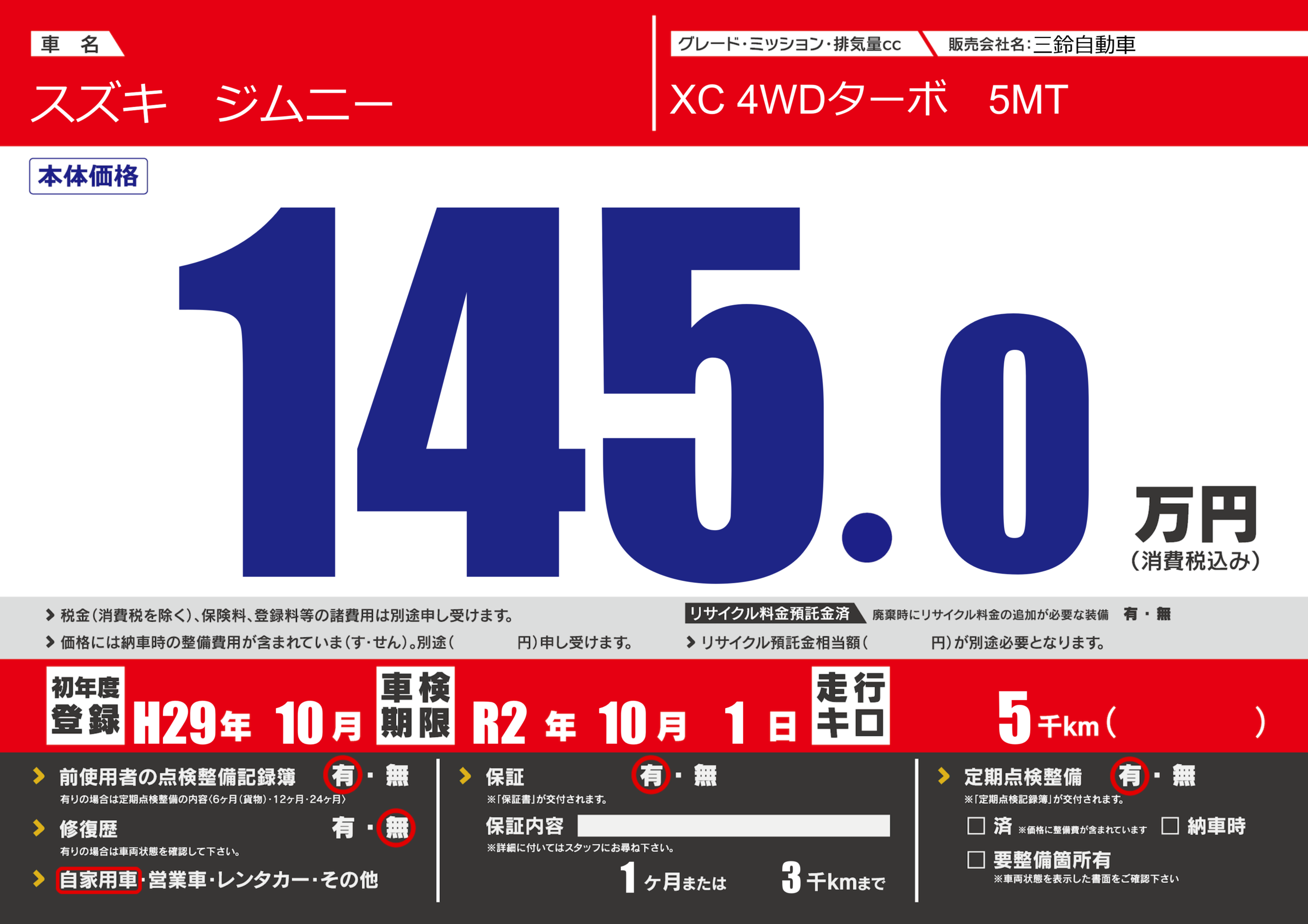 | 車名 | スズキ ジムニー | グレード ミッション 排気量 |