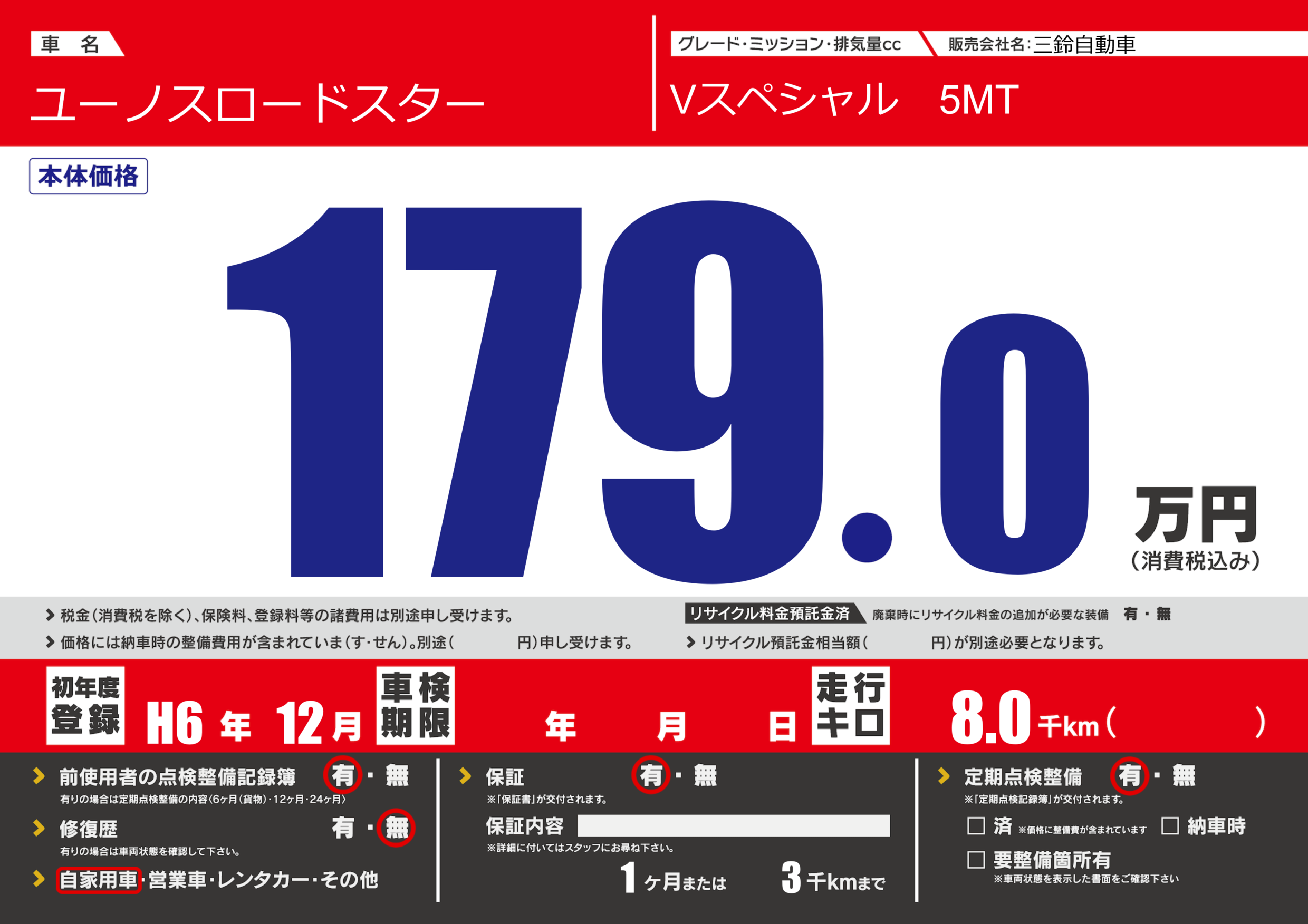 | 走行キロ | 0.8万km | 初年度登録 | H6年12月 |