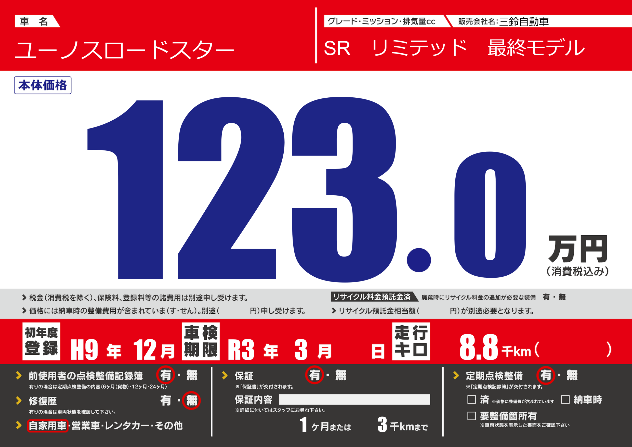 | 車名 | ユーノスロードスター | グレード ミッション 排気量 |