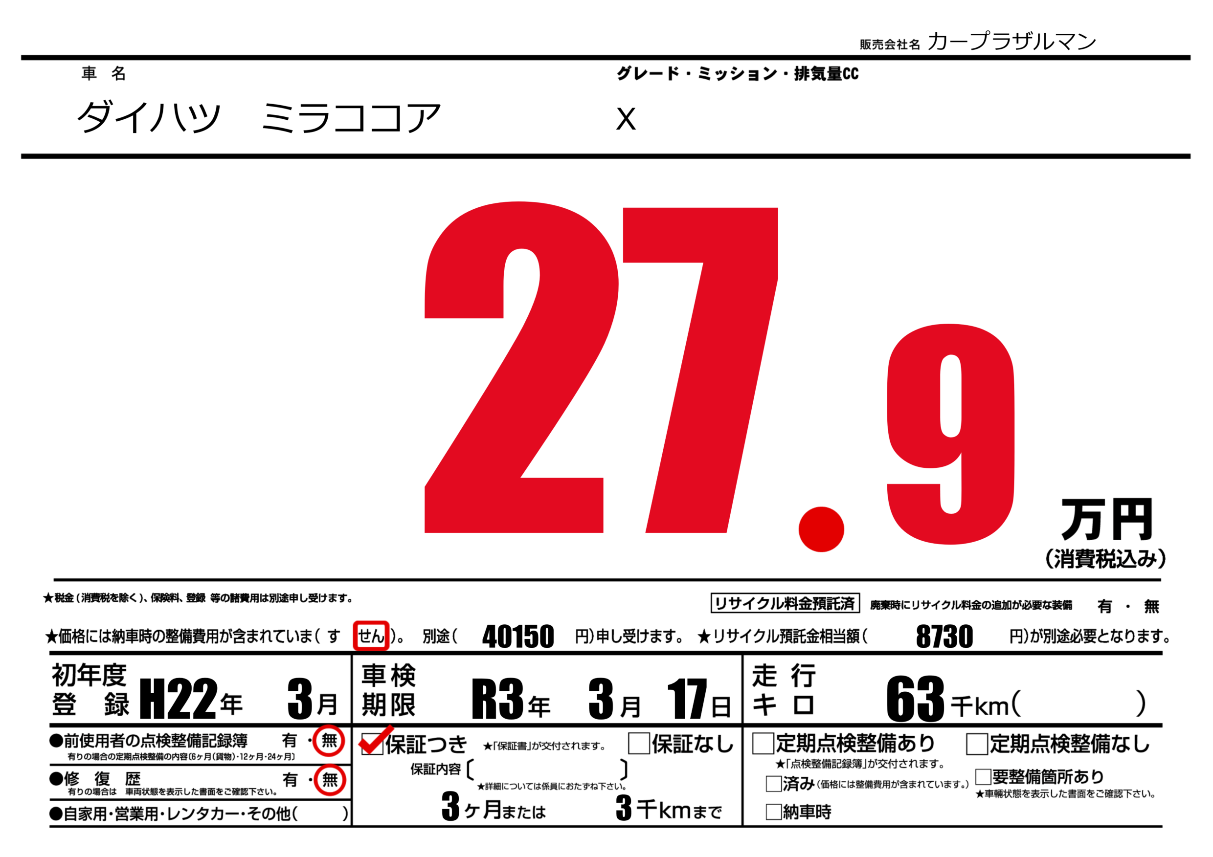 保証付き 保証内容(---) 3ヶ月または(3)千kmまで |