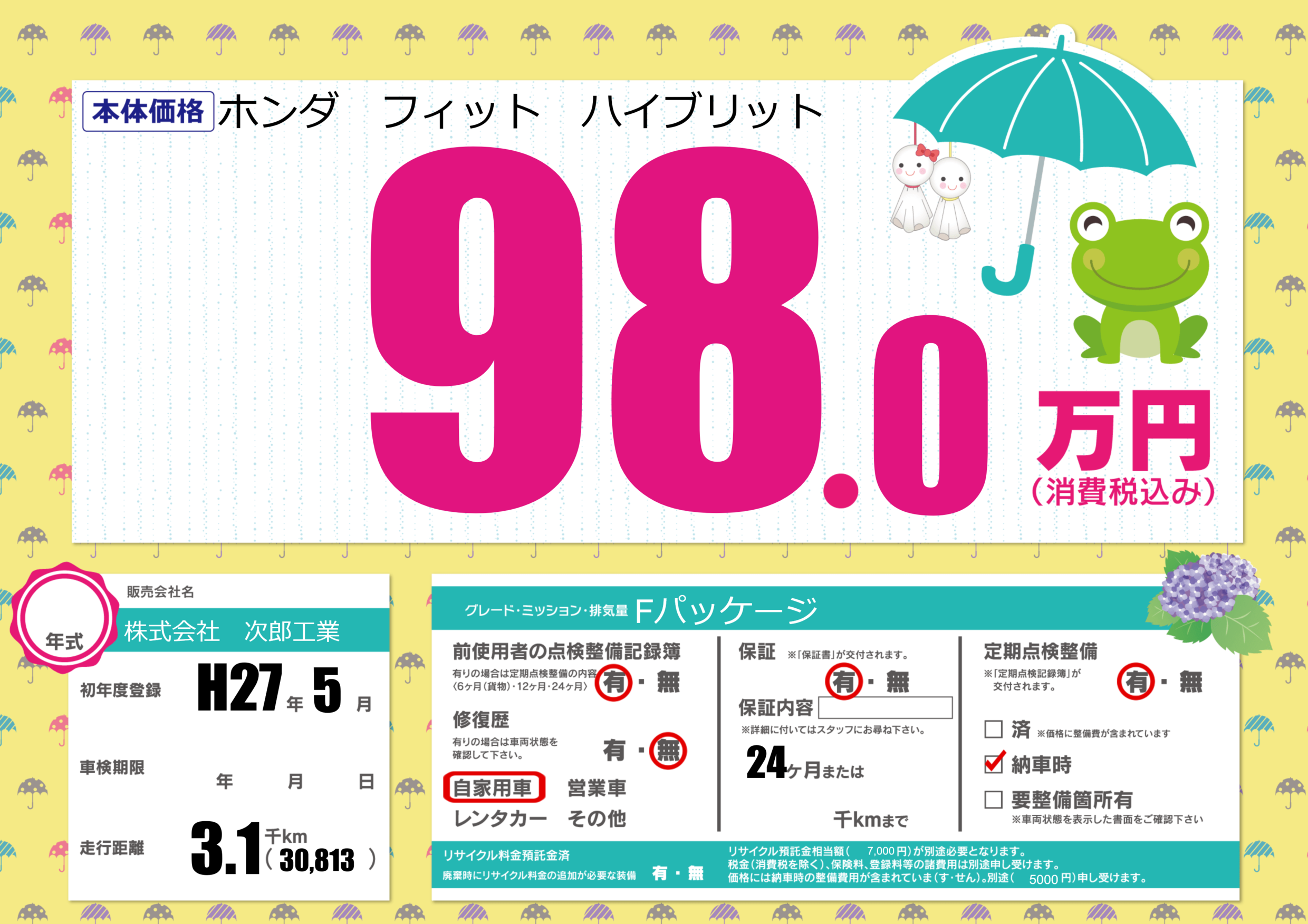 | 車名 | ホンダ フィット ハイブリット | グレード ミッション 排気量 |