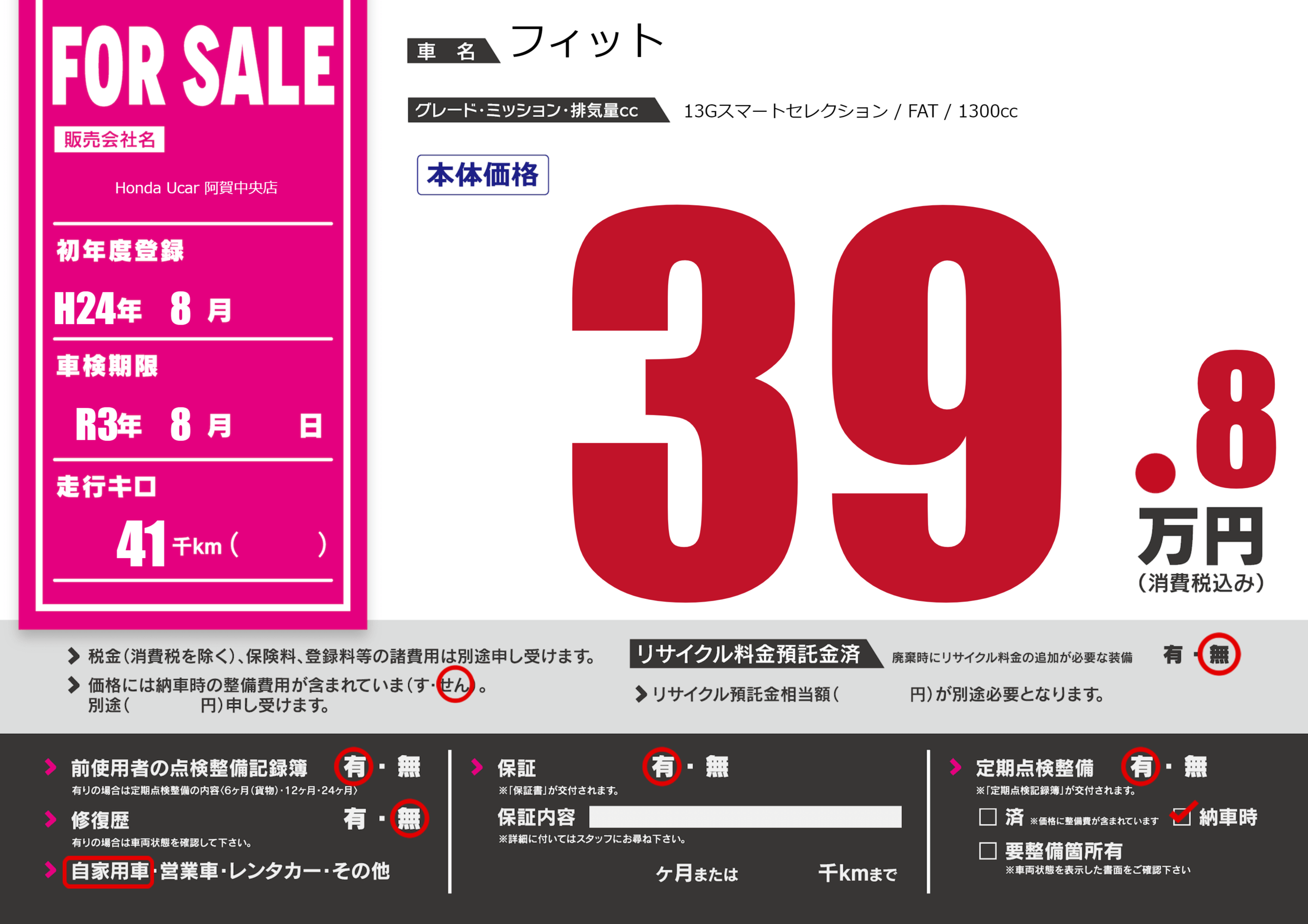 | 車検制限 | R3年 8月 - 日 | ||