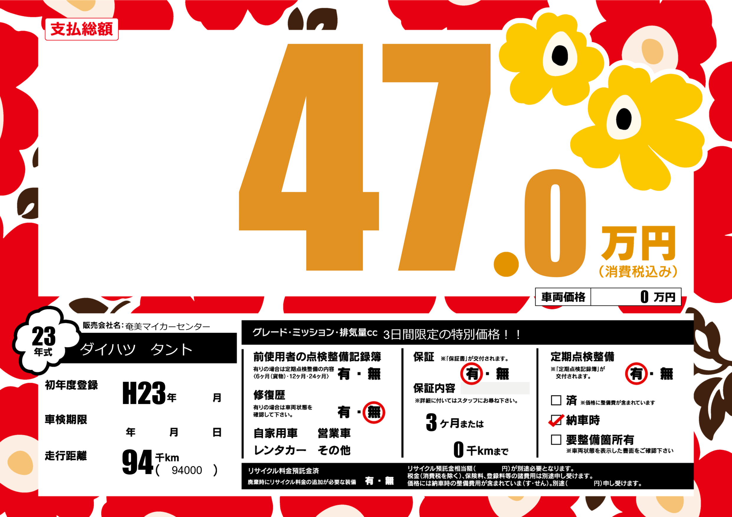 | 車名 | ダイハツ タント | グレード ミッション 排気量 |