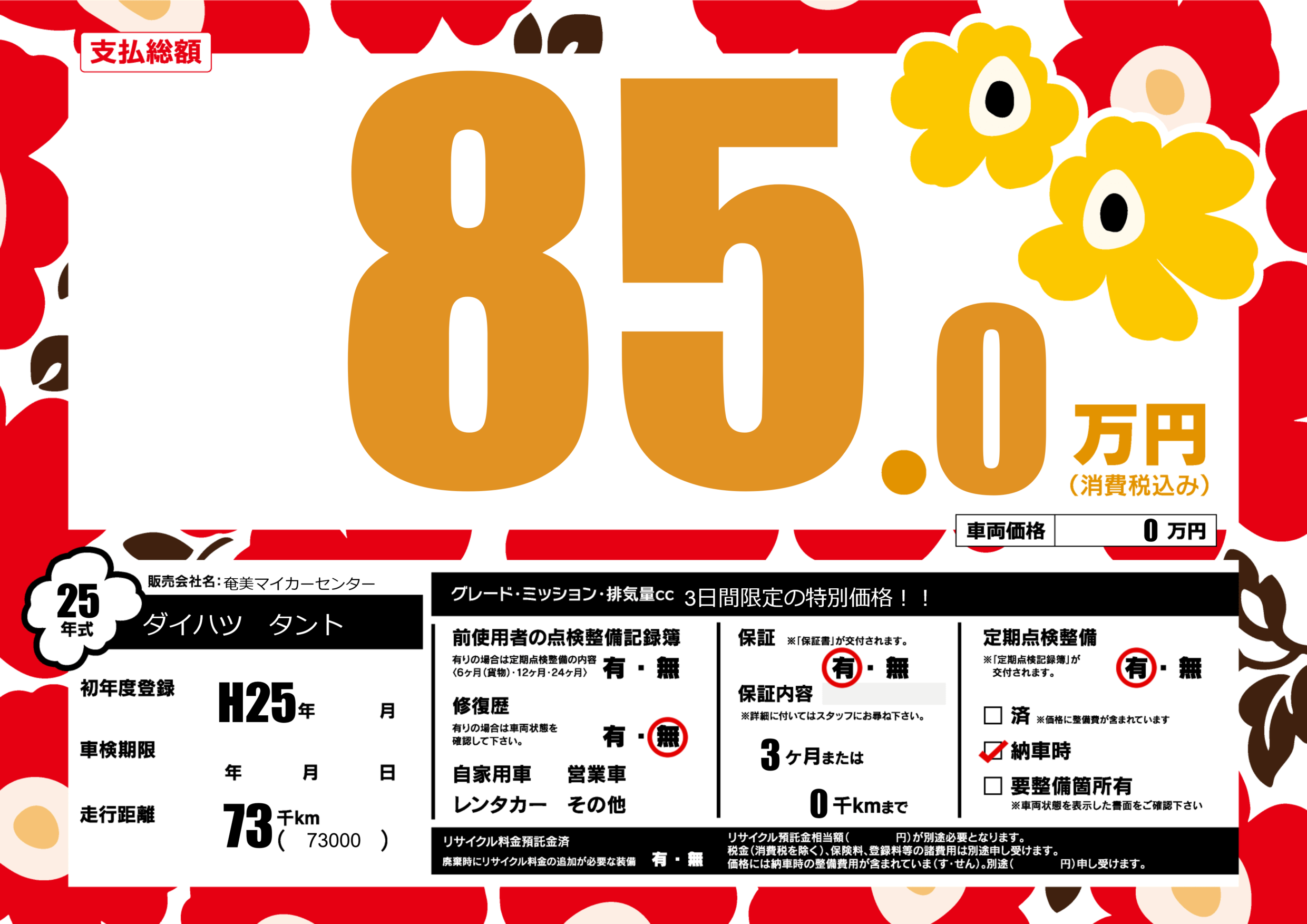 | 車名 | ダイハツ タント | グレード ミッション 排気量 |