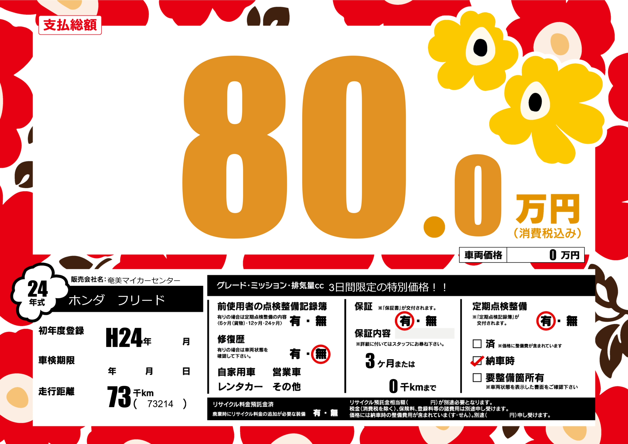 保証付き 保証内容(---) 3ヶ月または(0)千kmまで |