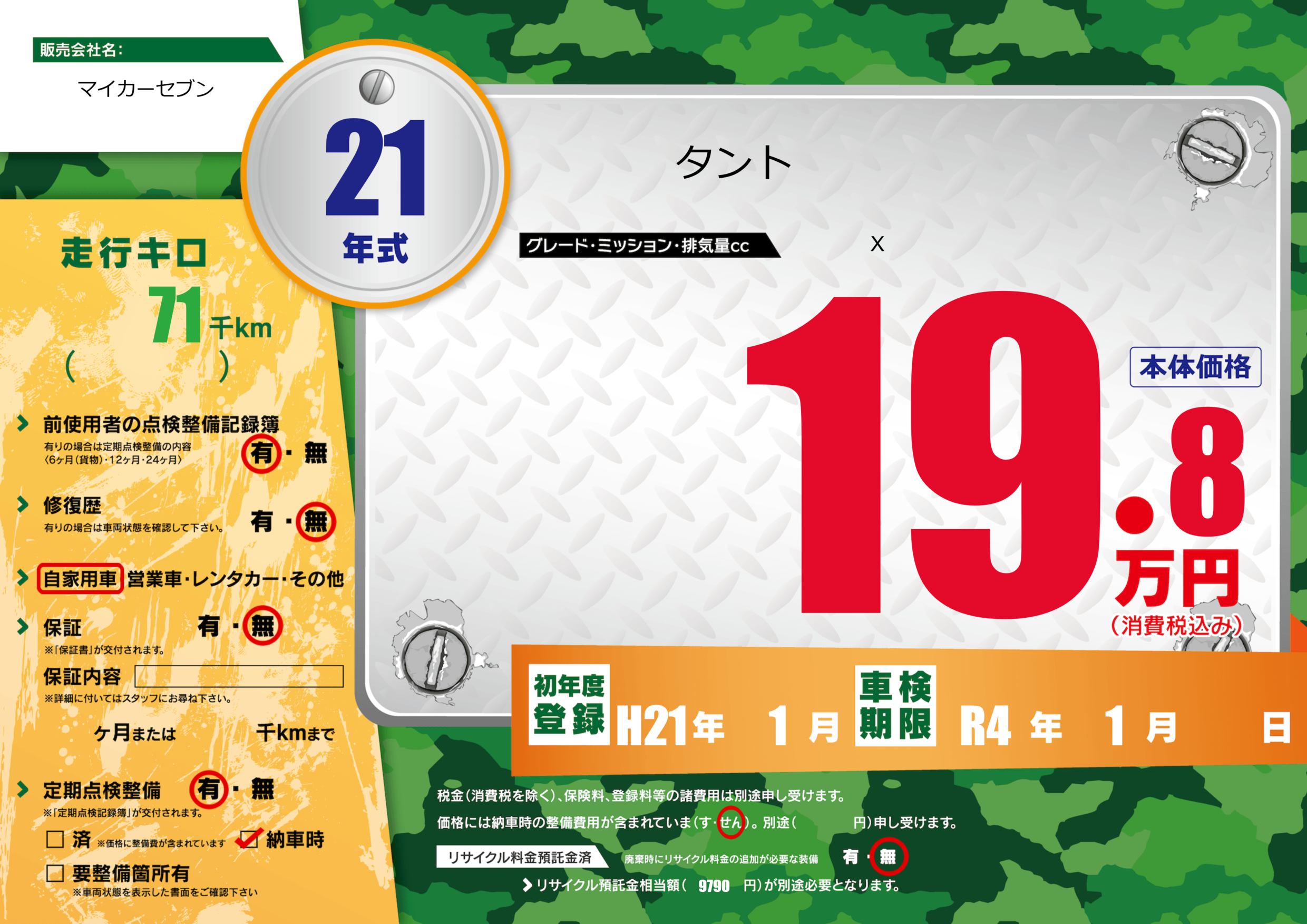 | 走行キロ | 7.1万km | 初年度登録 | H21年1月 |