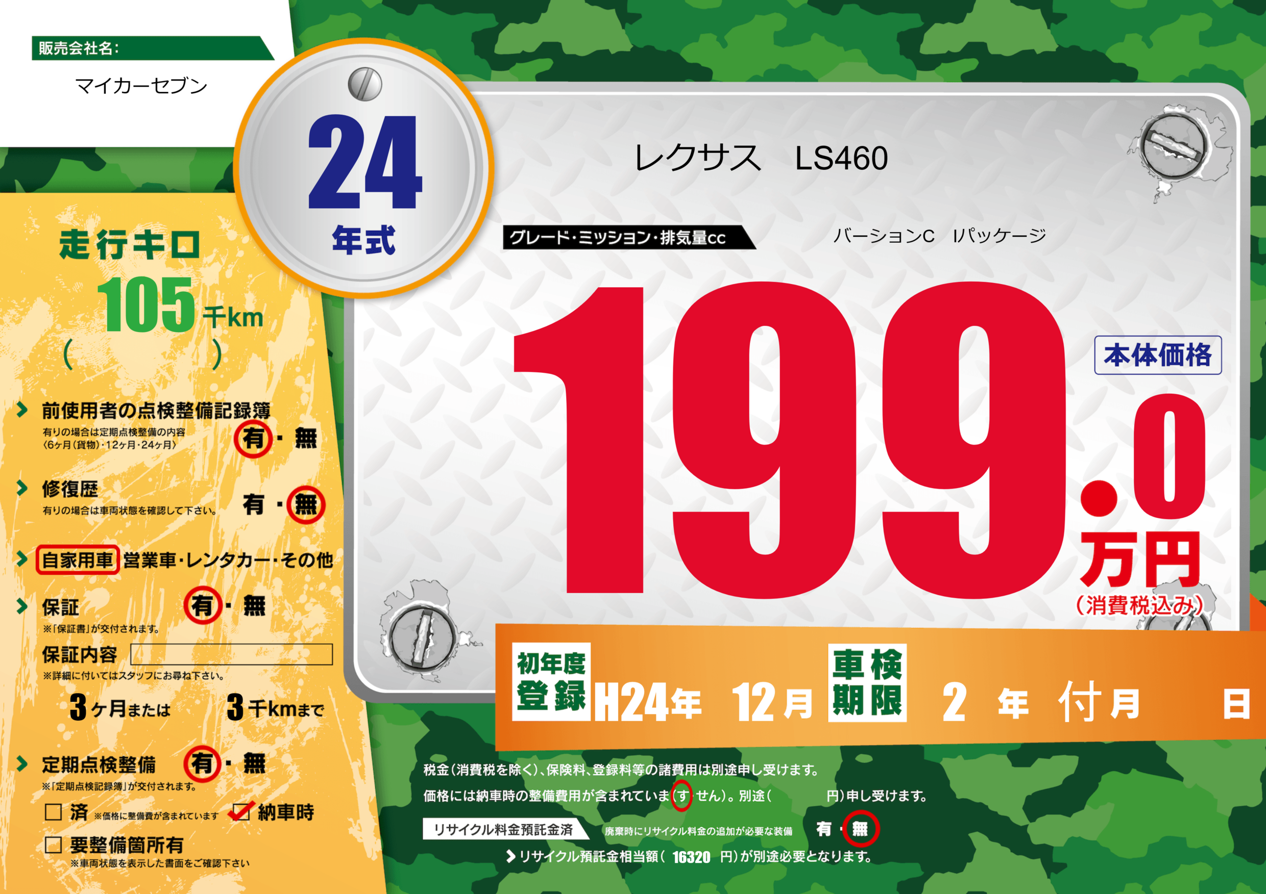 | 車名 | レクサス LS460 | グレード ミッション 排気量 |