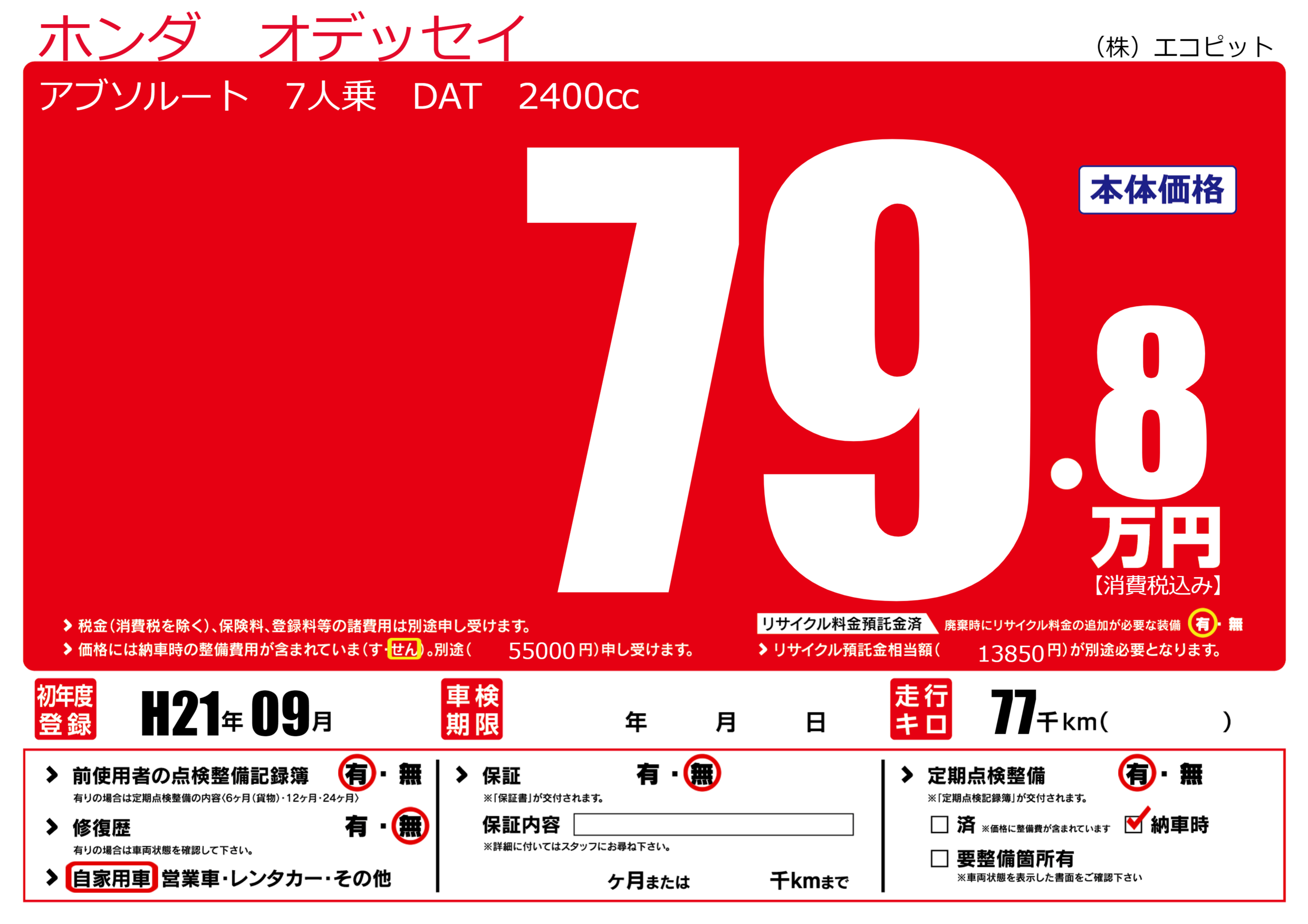 | 走行キロ | 7.7万km | 初年度登録 | H21年09月 |
