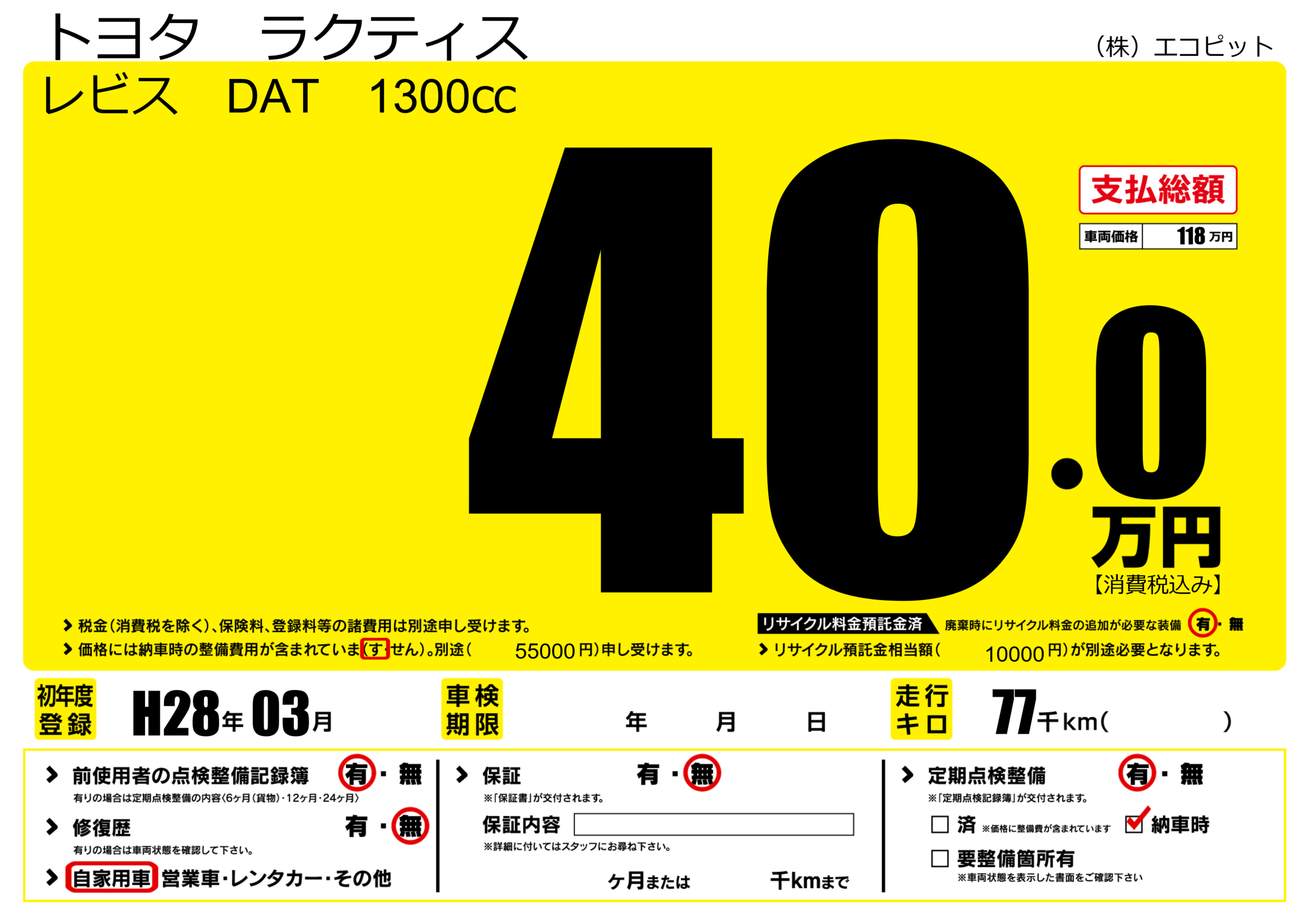 | 車名 | トヨタ ラクティス | グレード ミッション 排気量 |