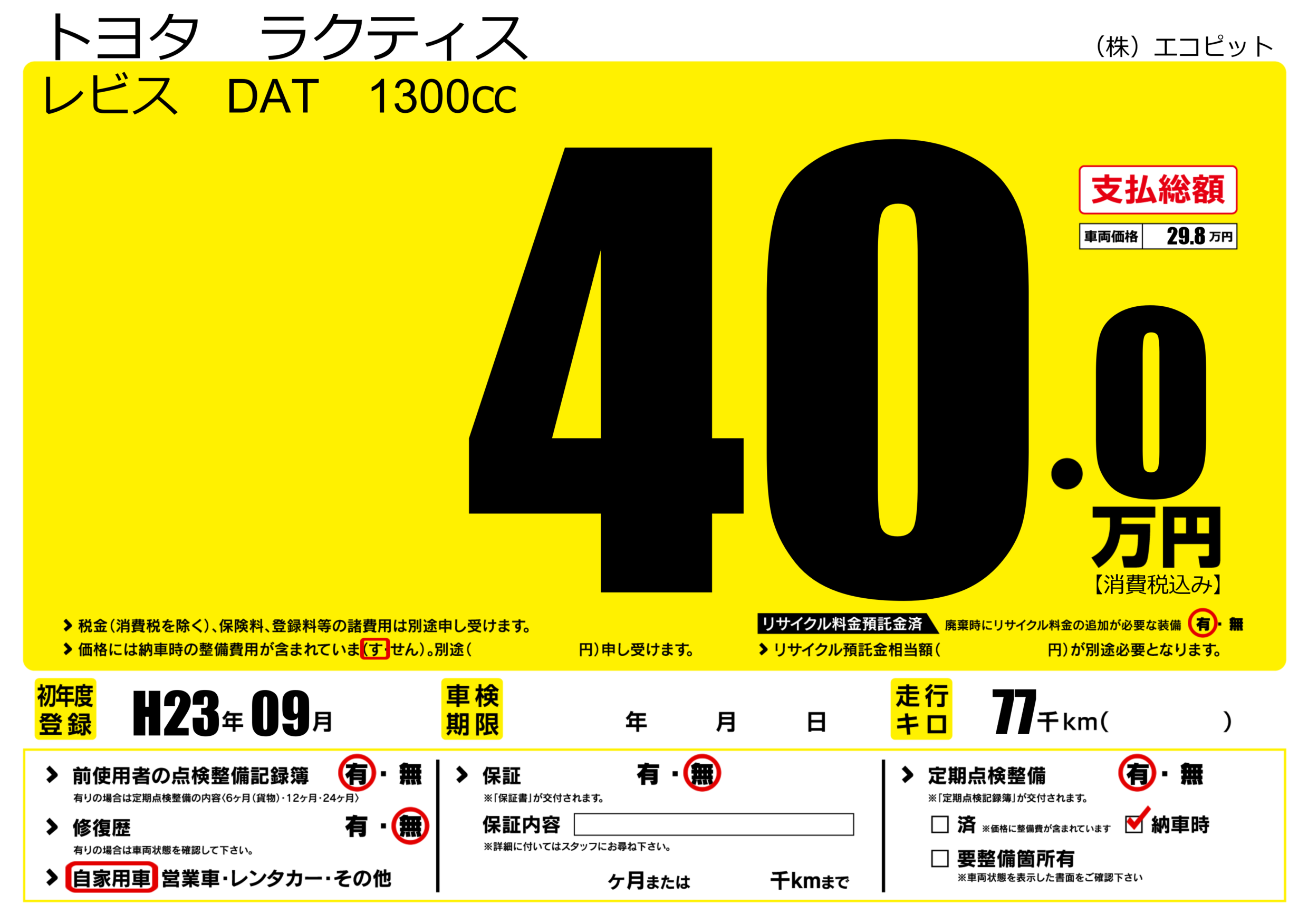 | 走行キロ | 7.7万km | 初年度登録 | H23年09月 |