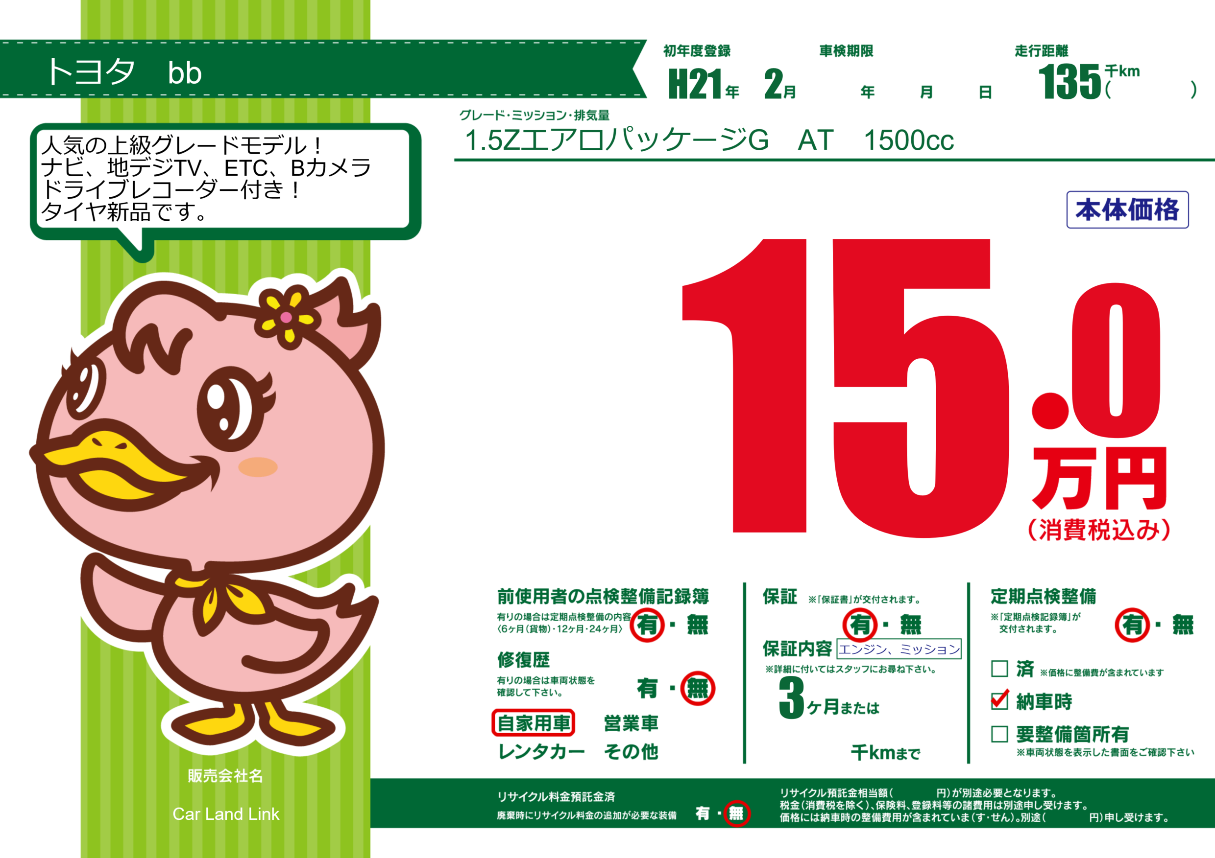 | 車名 | トヨタ bb | グレード ミッション 排気量 |