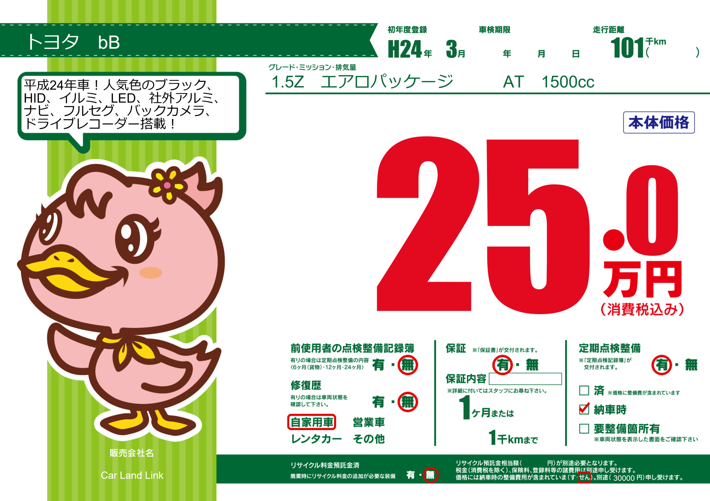 | 車名 | トヨタ bB | グレード ミッション 排気量 |