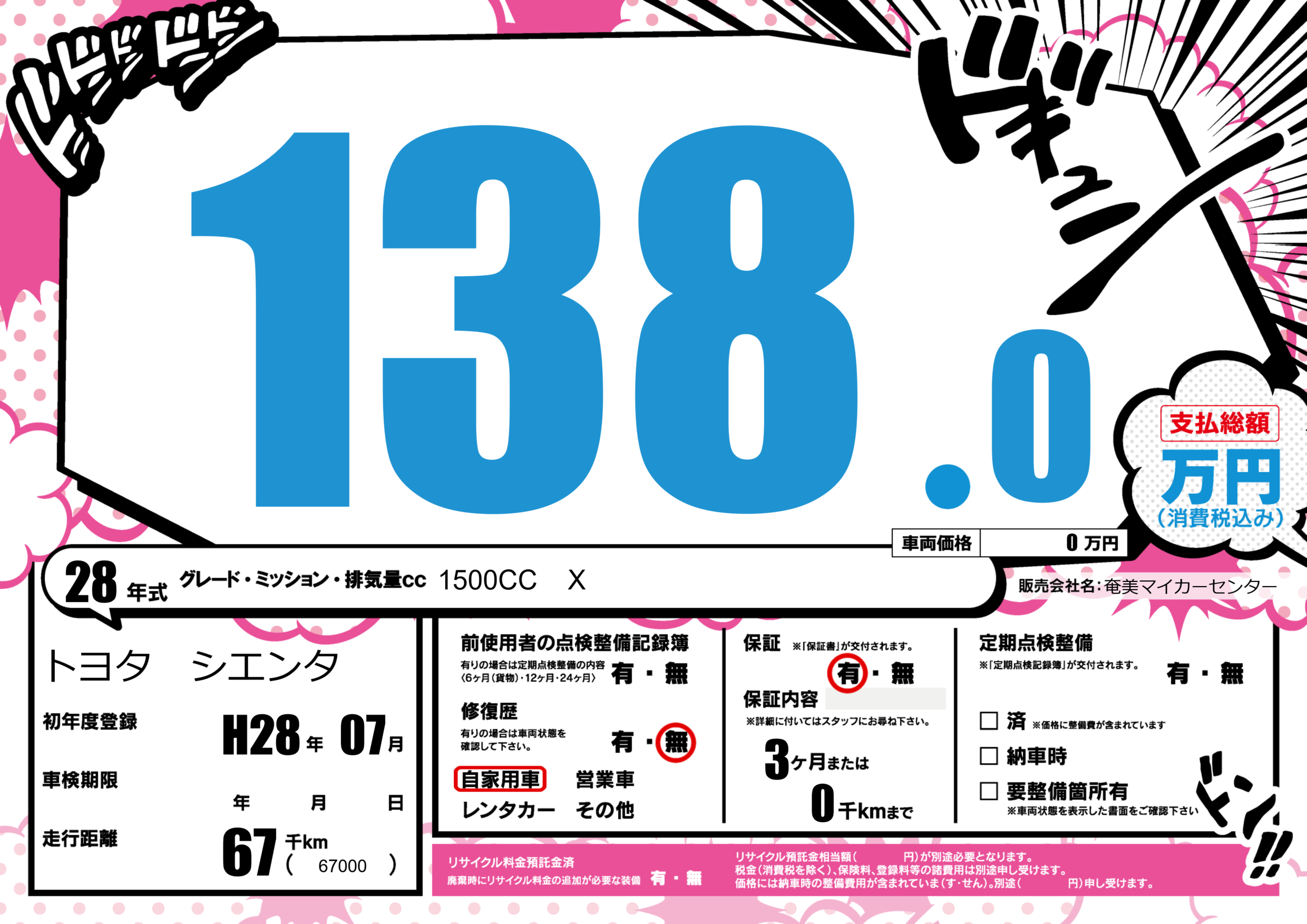 | 車名 | トヨタ シエンタ | グレード ミッション 排気量 |