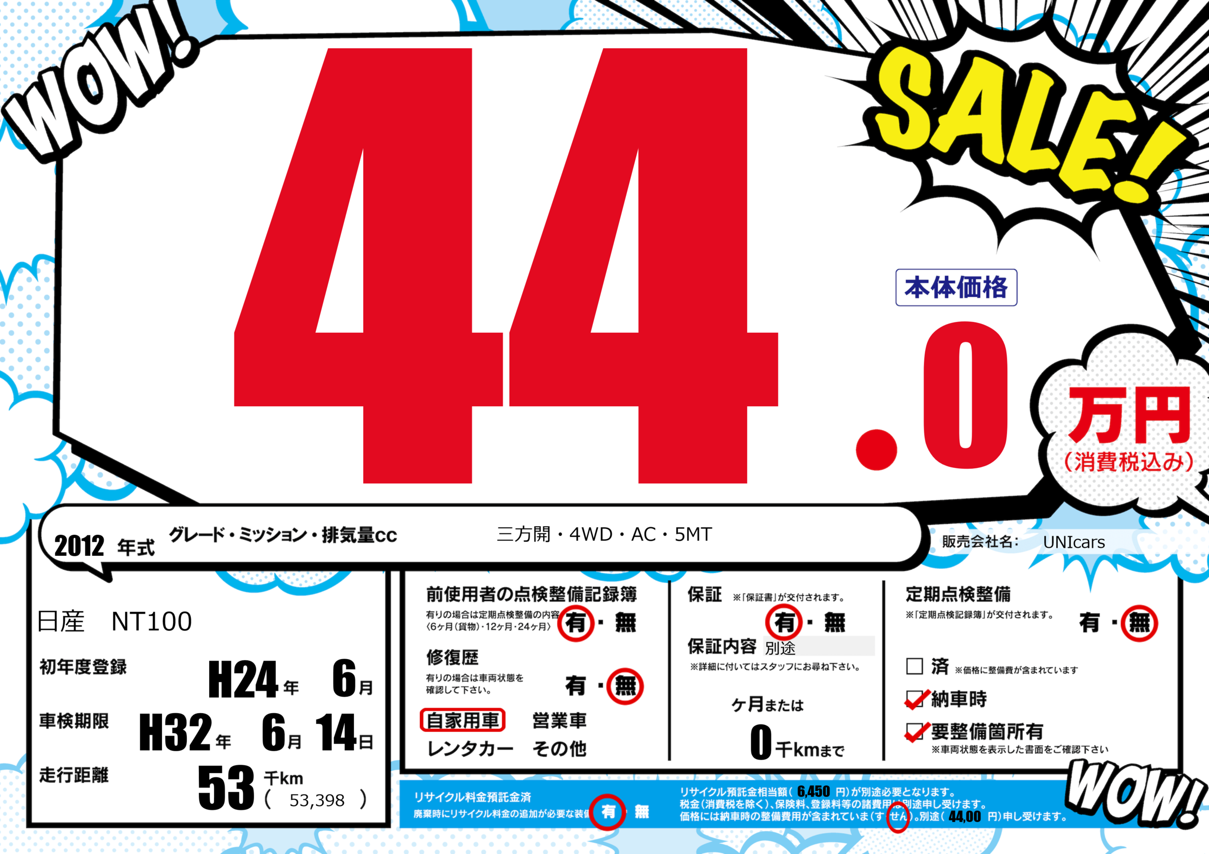 保証付き 保証内容(別途) ---ヶ月または(0)千kmまで |