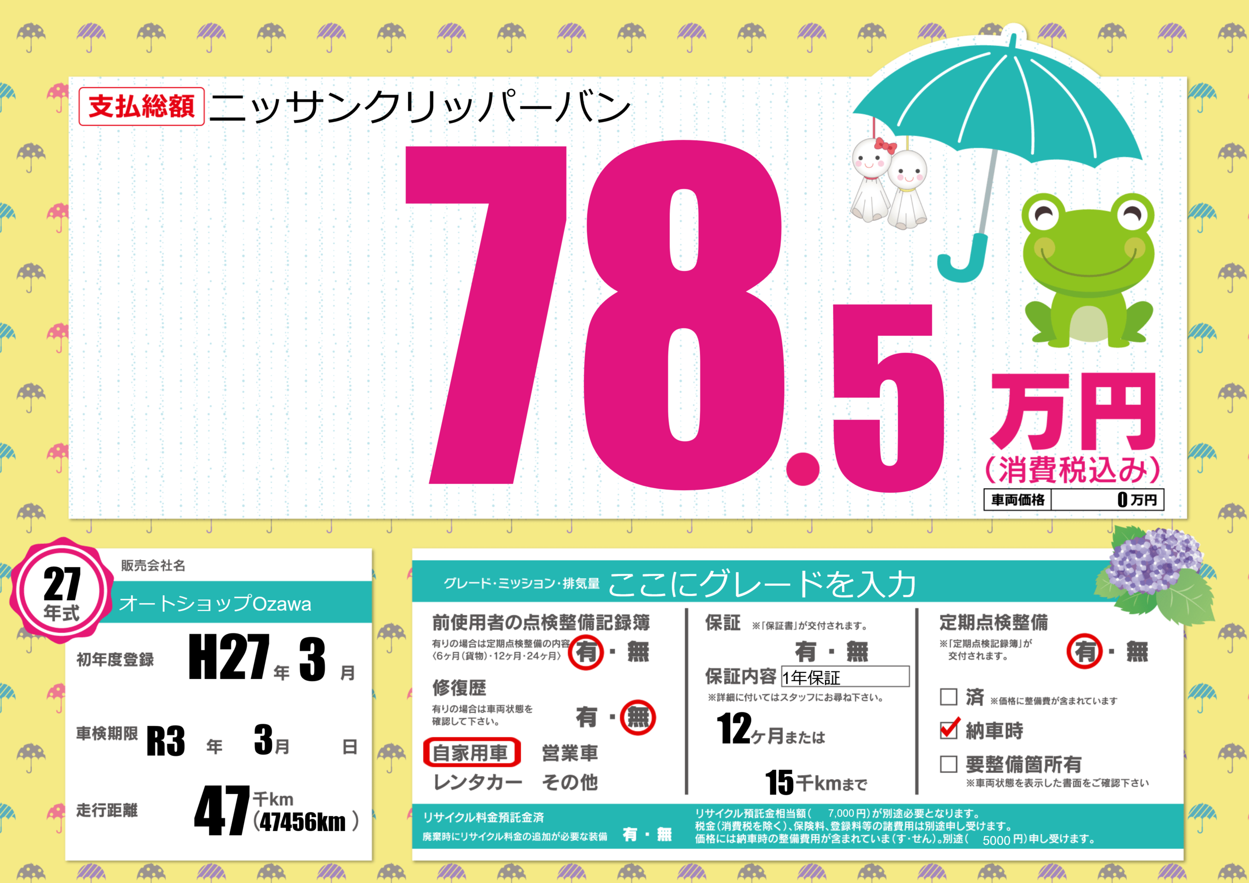 | 車検制限 | R3年 3月 - 日 | ||