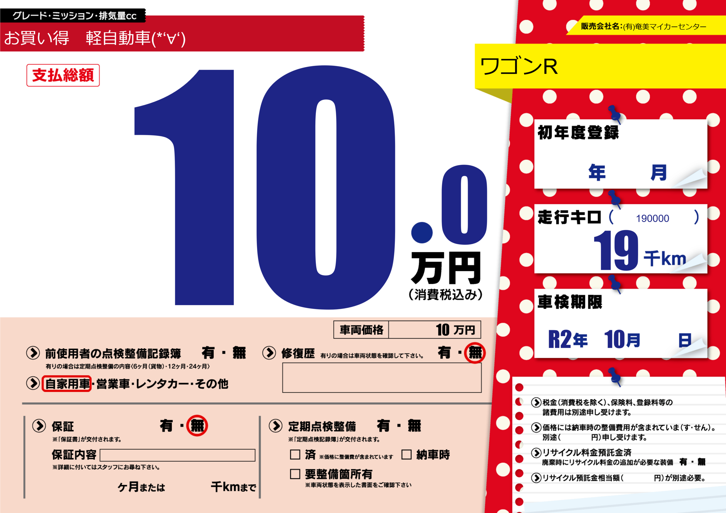 | 車名 | ワゴンR | グレード ミッション 排気量 |