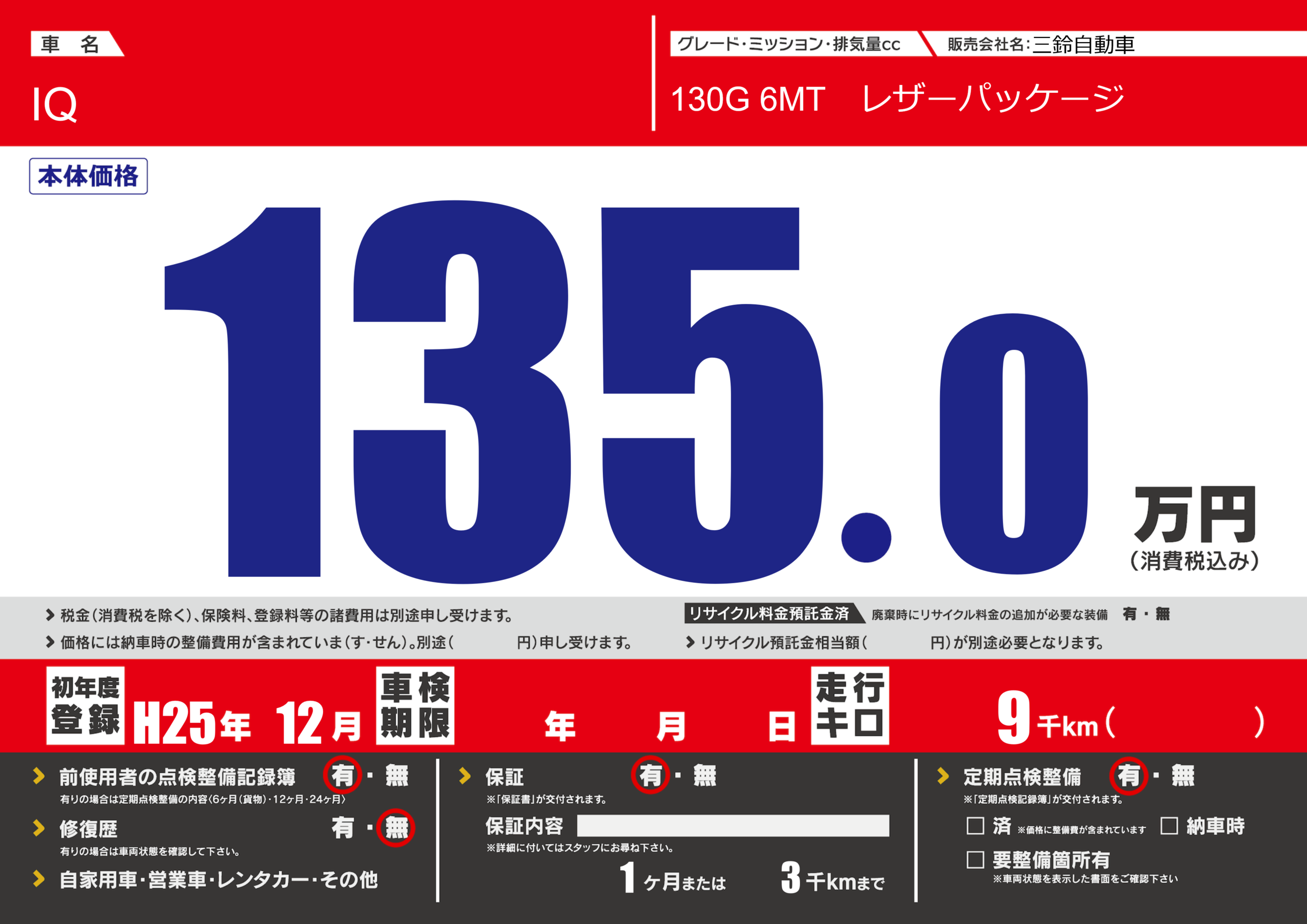 | 走行キロ | 0.9万km | 初年度登録 | H25年12月 |
