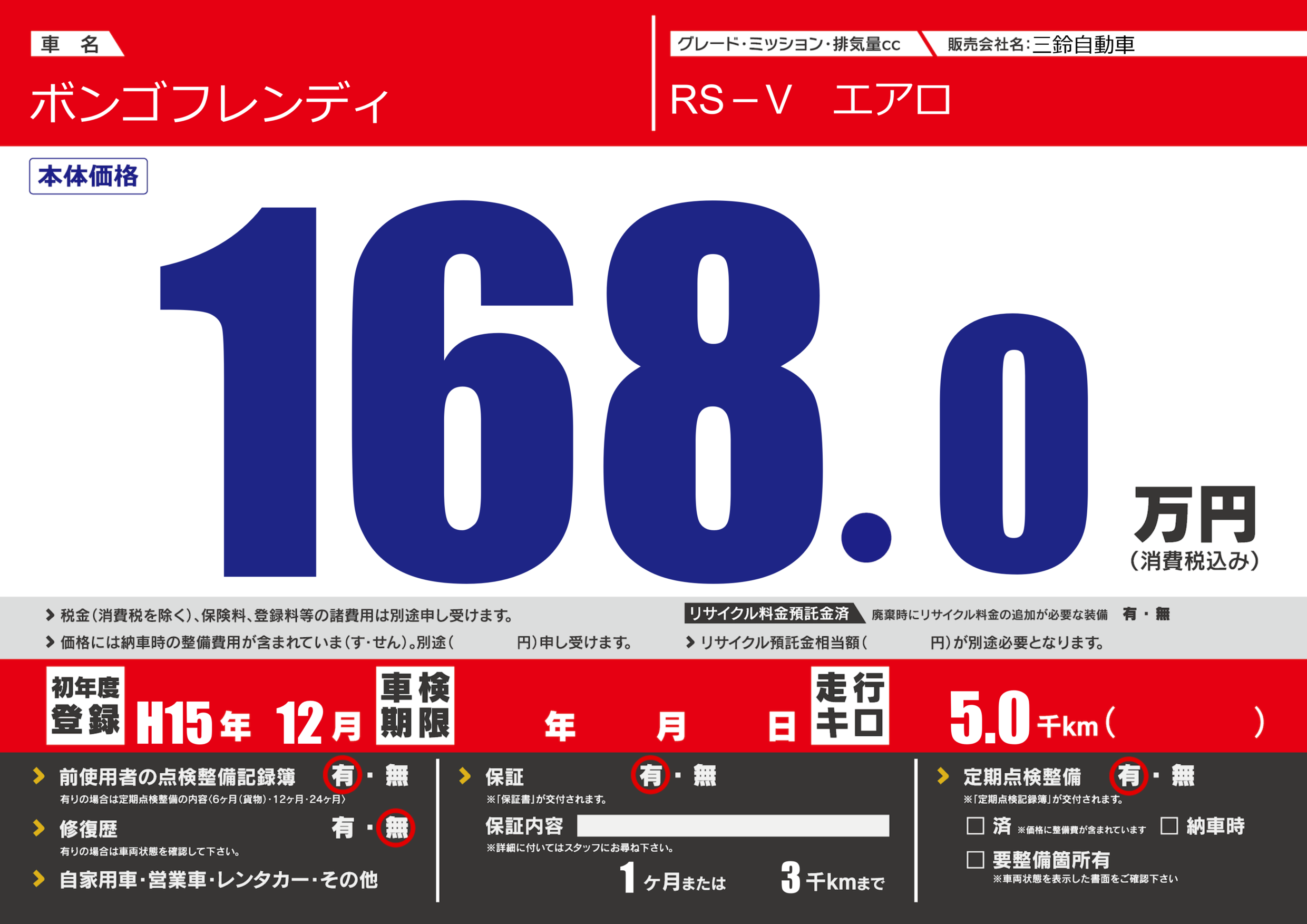 | 車名 | ボンゴフレンディ | グレード ミッション 排気量 |