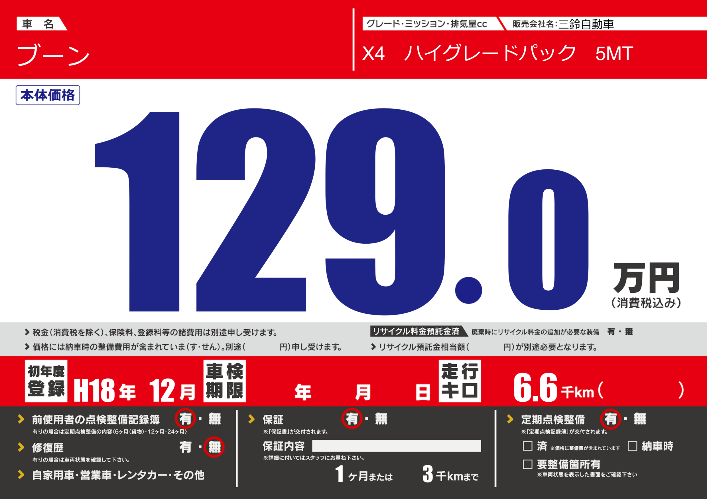 | 車名 | ブーン | グレード ミッション 排気量 |