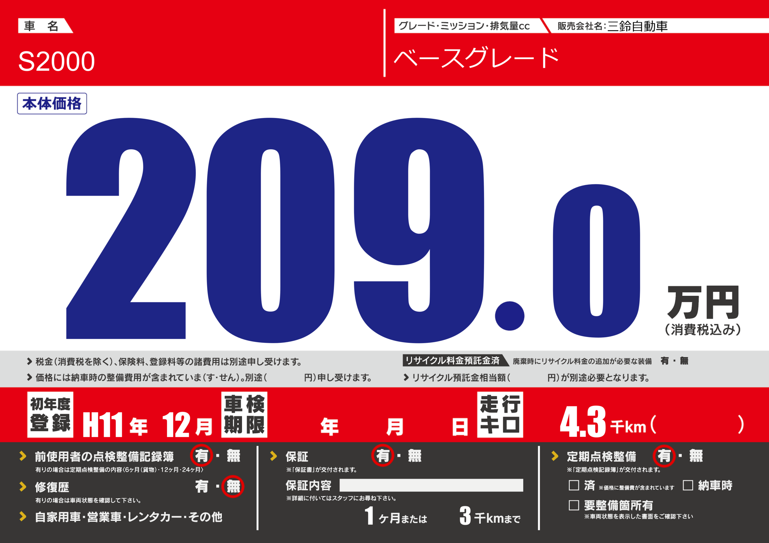 保証付き 保証内容(---) 1ヶ月または(3)千kmまで |
