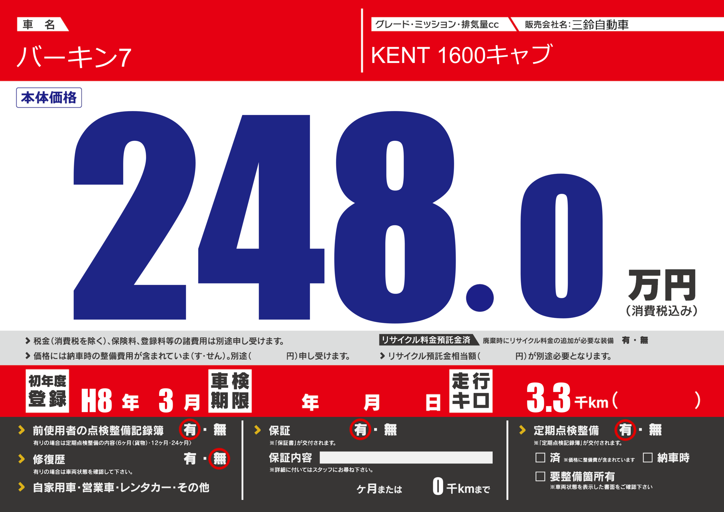 | 走行キロ | 0.3万km | 初年度登録 | H8年3月 |