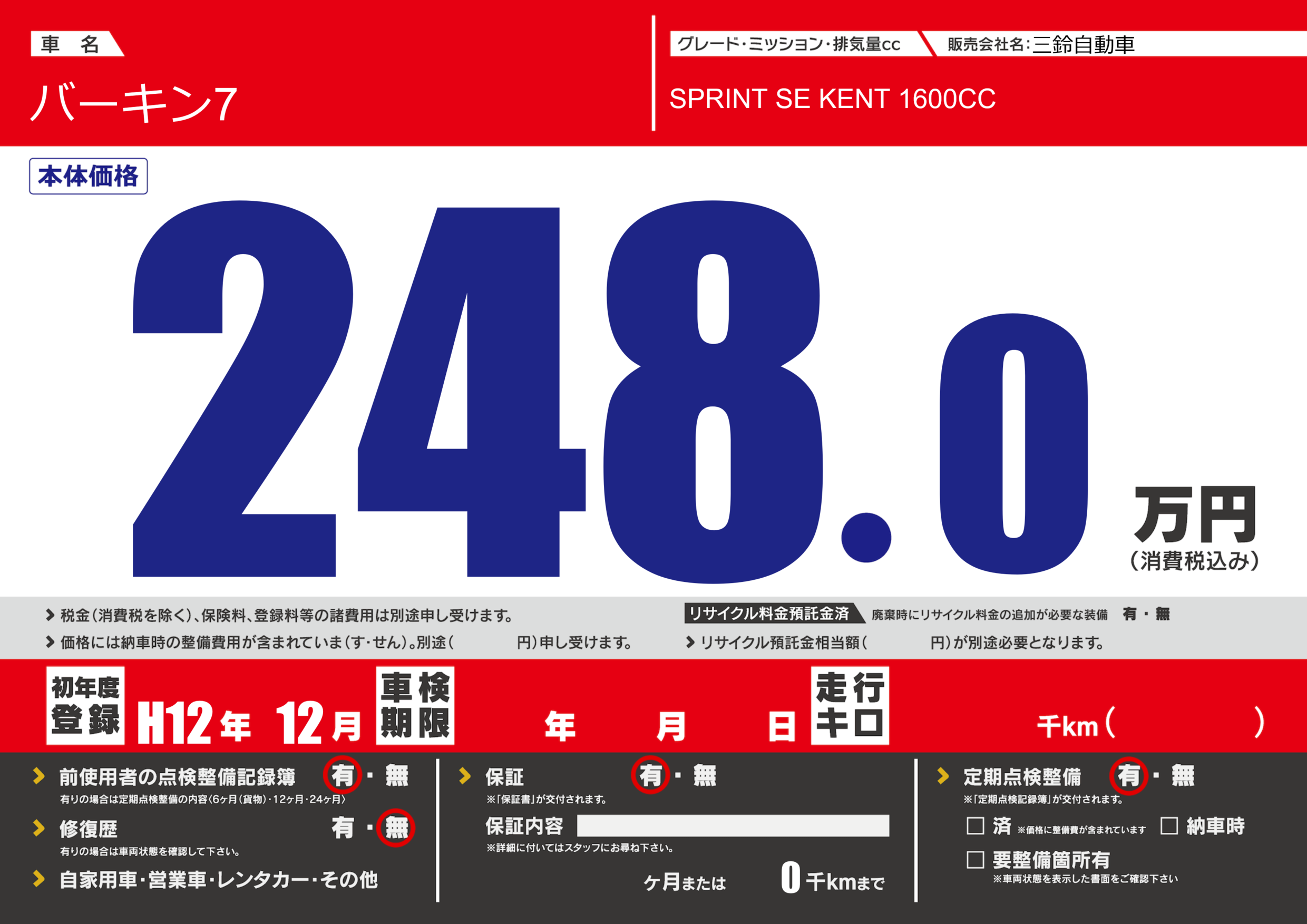 | 走行キロ | - | 初年度登録 | H12年12月 |