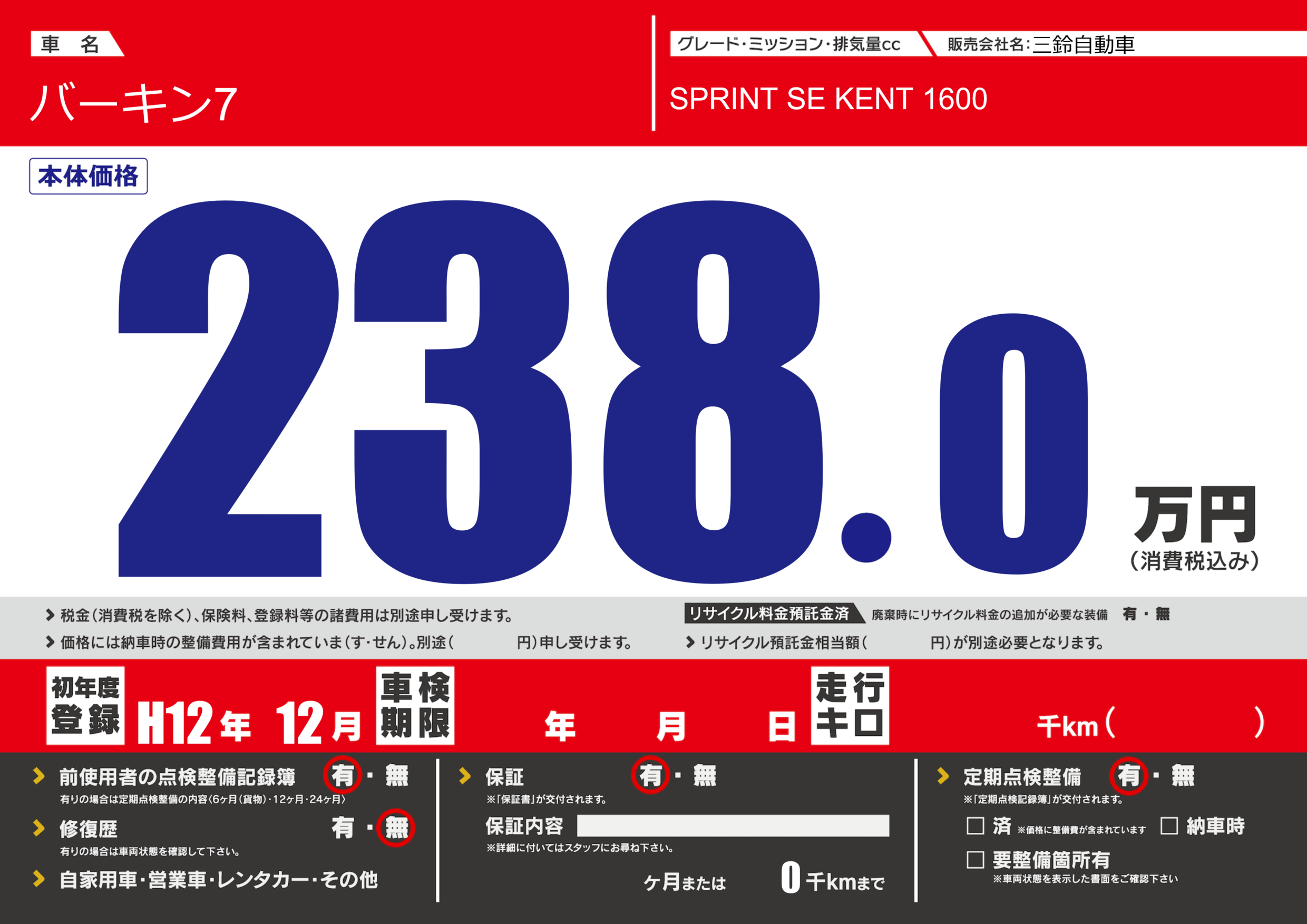 | 走行キロ | - | 初年度登録 | H12年12月 |