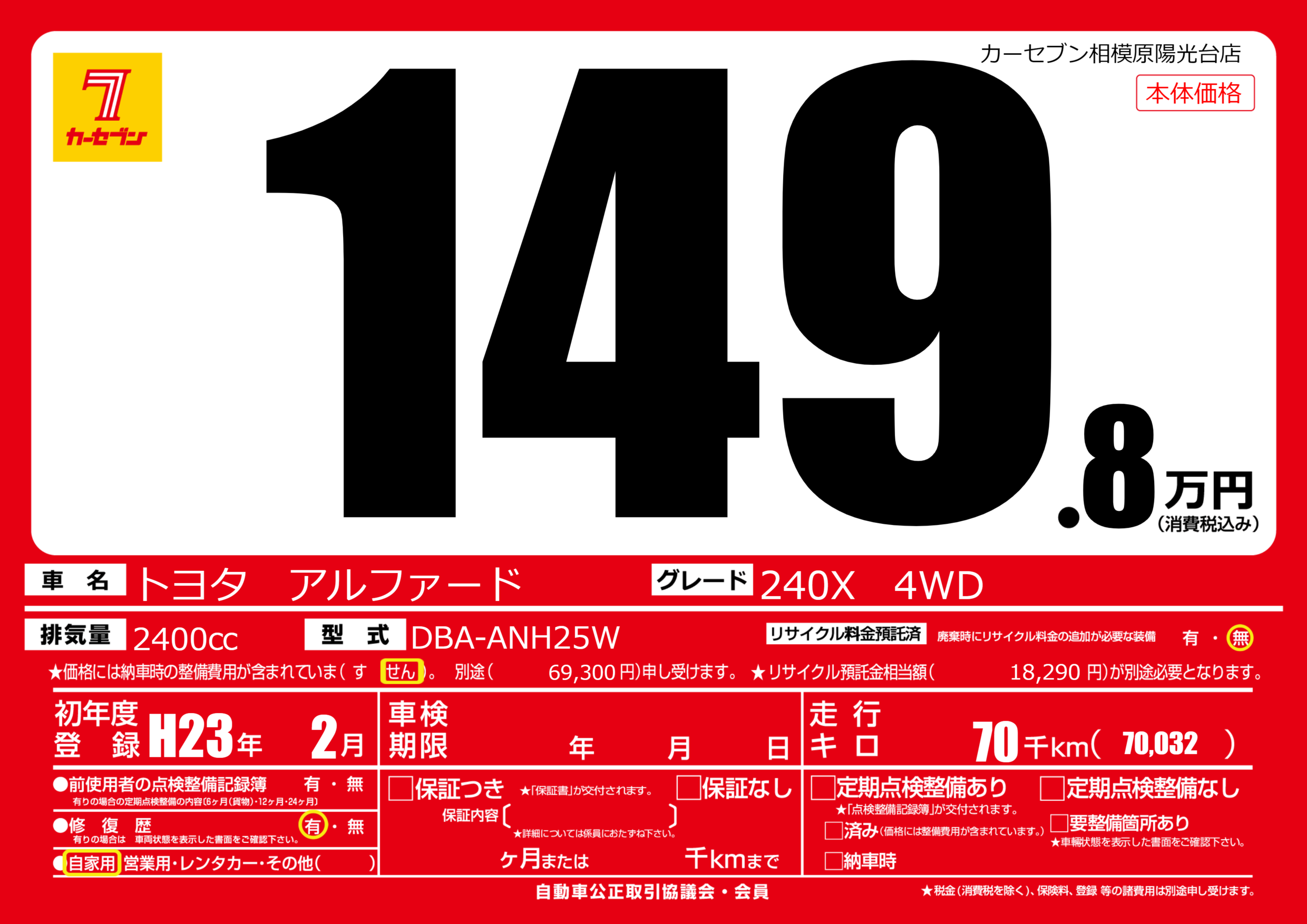 | 走行キロ | 7万km | 初年度登録 | H23年2月 |