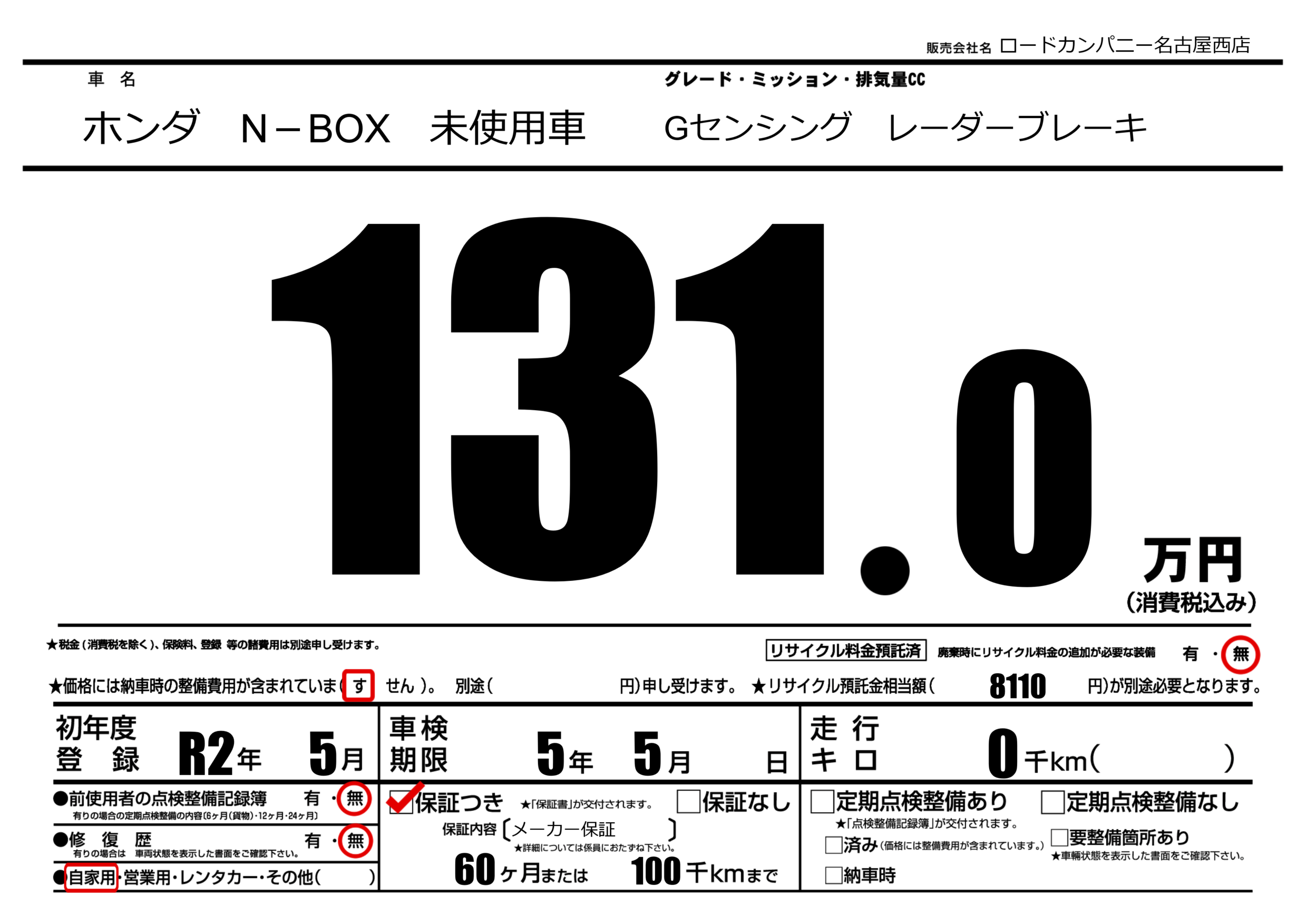 保証付き 保証内容(メーカー保証) 60ヶ月または(100)千kmまで |